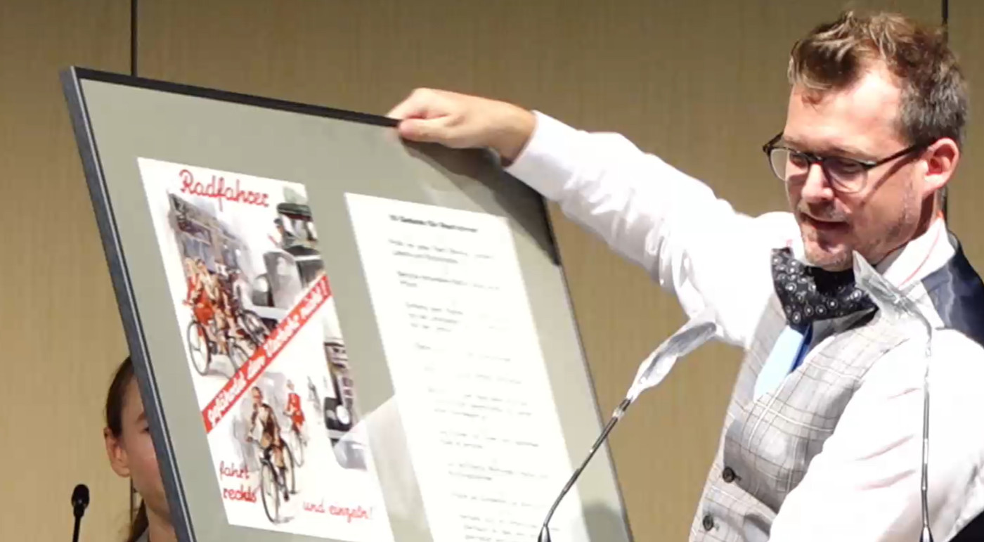 Zu Beginn der Stadtratssitzung hatte Oberbürgermeister Hilbert den scheidenden Baubürgermeister Raoul Schmidt-Lamontain mit einer kurzen Laudatio zu dessen Wirken in den vergangenen fünf Jahren verabschiedet und ihm zur Erinnerung ein Bild zum Thema Radfahrer und Autoverkehr überreicht – mit einem Augenzwinkern aus einer Zeit vor einhundert Jahren. Wegen der zunehmenden Anzahl von Autos auf den Straßen wurden damals die Radfahrer aufgefordert, nicht den Verkehr zu gefährden, immer einzeln und rechts zu fahren. „Der Abschied tut mir auch ein wenig weh. Es hat hier immer großen Spaß gemacht“, bedankte sich Schmidt-Lamontain und fügte hinzu. „An fünf Jahren fehlten mir 8 Tage.“