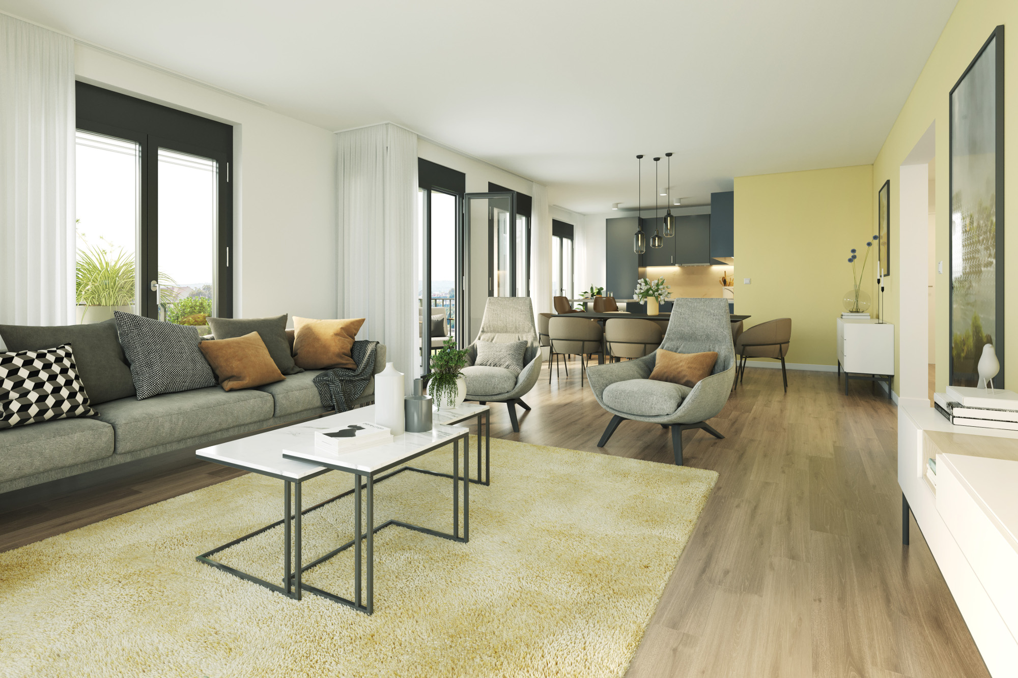 Die Fassaden der Wohngebäude sind aufwändig mit Riemchenklinker gestaltet. Die Innenhöfe sollen parkähnlich angelegt werden. Aufzüge und barrierefreie Wohnungszugänge von der Tiefgarage aus gehören ebenfalls zur Ausstattung wie mindestens ein Balkon oder ein Terrasse je Wohnung. Die größeren Wohnungen verfügen zudem über ein Gäste-WC. Elektrische Markisen, Fußbodenheizung, bodentief geflieste Duschen sind ebenfalls vorgesehen. Abstellplätze für Fahrräder und Kinderwagen gibt es in der Tiefgarage.