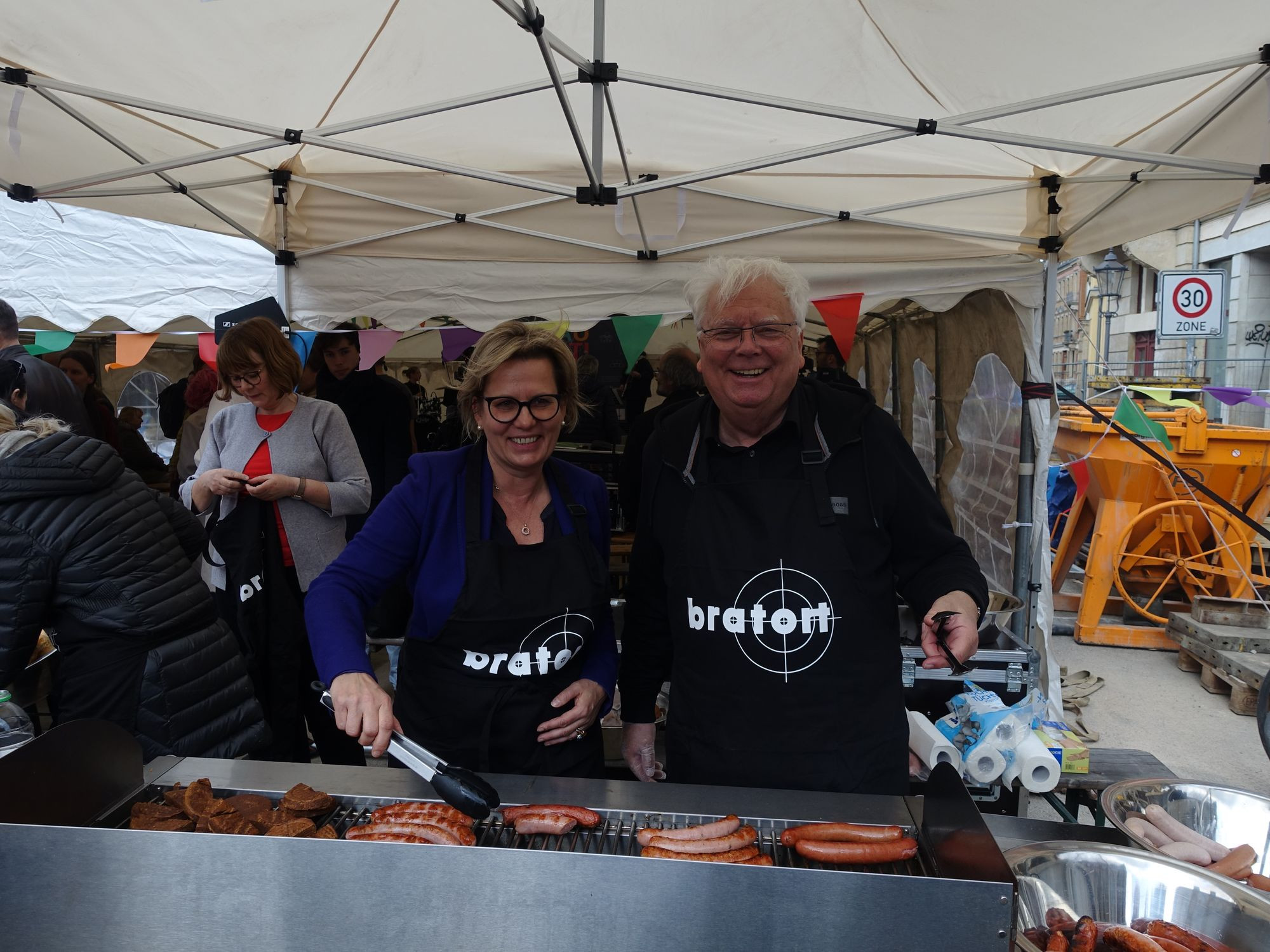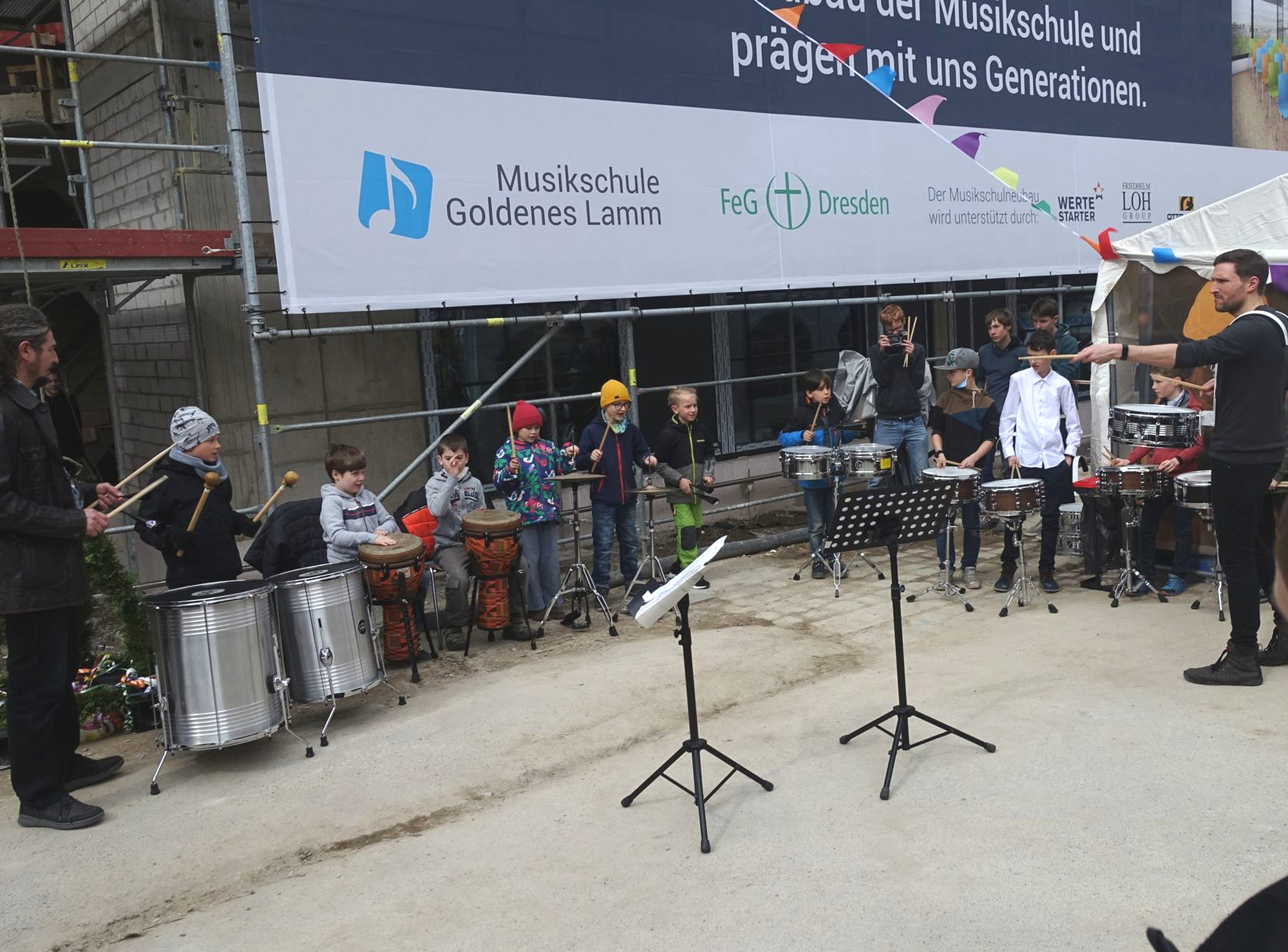 „Ich habe wirklich Feuer gefangen“, erinnerte sich Barbara Klepsch an ihre ersten Begegnung mit dem Team der Musikschule und dessen Arbeit. Die Ministerin für Kultur und Tourismus ist CDU-Landtagsabgeordnete für den Wahlkreis, in dem auch der Stadtbezirk Pieschen liegt. „Musizieren gehört zu den Grundpfeilern kultureller Bildung für Kinder und Jugendliche, aber auch für Erwachsene. Das Erlernen eines Instrumentes schult nicht nur musikalische Fähigkeiten; es stärkt das Selbstvertrauen der Schülerinnen und Schüler und trägt zur Persönlichkeitsbildung bei. Musizieren in der Gruppe vermittelt soziale Kompetenzen; es entsteht ein Gemeinschaftsgefühl, dass von Toleranz und Wertschätzung getragen wird“, sagte Klepsch in ihrem Grußwort und war sich darin einig mit Hartmut Hühnerbein, Vorstandsvorsitzender der „Stiftung für christliche Wertebildung (Wertestarter)“ aus Berlin und Haiger, die das Bauvorhaben von Anfang an unterstützt. „Ich sehe die Musikschule vor allem als Lebensschule. Das Dach, das wir jetzt setzen, soll sich als schützend und bewahrend auch über die Zukunft der Schülerinnen und Schüler legen“, so Hühnerbein. Klepsch und Hühnerbein lösten dann ihr zur Grundsteinlegung gegebenes Versprechen ein und luden zu Essen und Trinken am Grill.