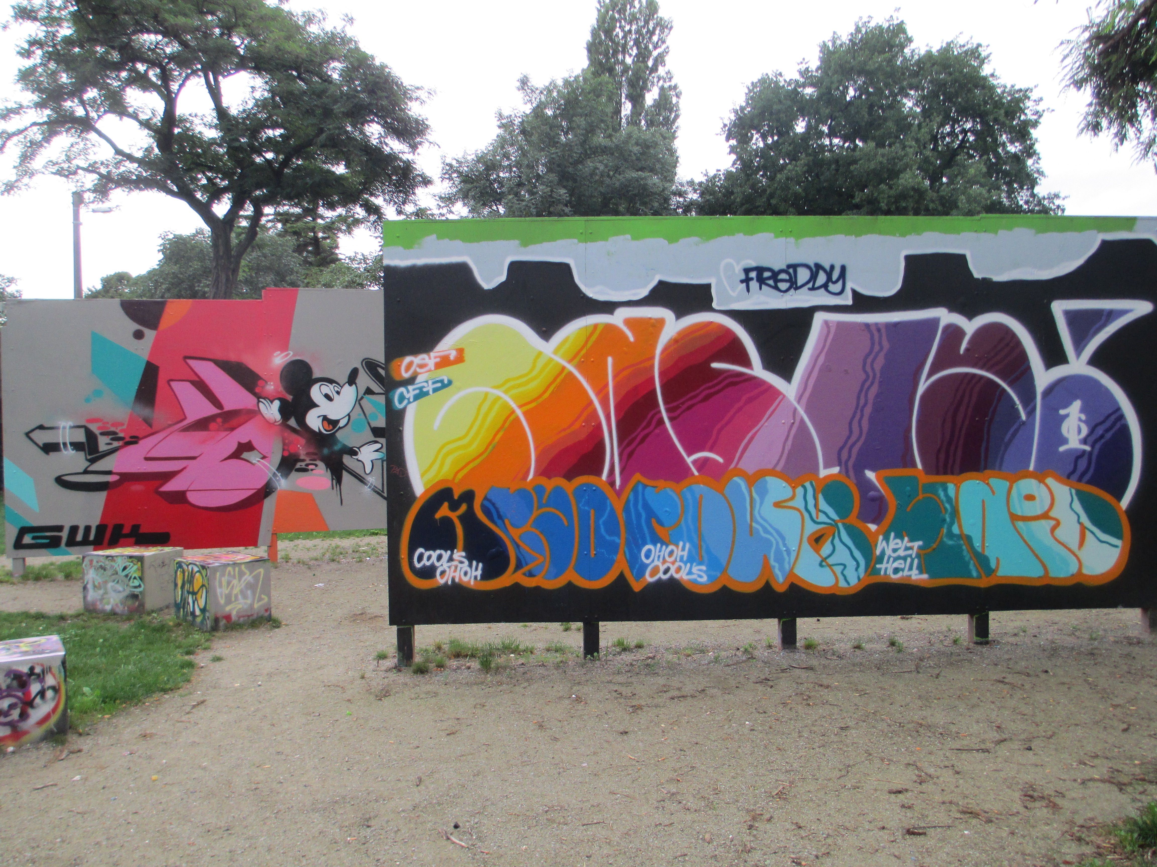 Dort hat, mittlerweile lauschig versteckt hinter Bäumen, das Spike einen Park für Graffiti-Künstler initiiert. „Als wir eröffnet haben, sah das noch ziemlich karg aus“, erinnert sich Demnitz-Schmidt. Das war im Frühjahr 2015. Kein Blatt zierte die Bäume und die großen weißen Malwände harrten noch der Kunstwerke, die da kommen sollten. Die Fläche wurde vom Ortsamt empfohlen und freigegeben. Anfangs sahen das Künstler und Jugendarbeiter skeptisch – ein Kunstort so nah an der Straße?