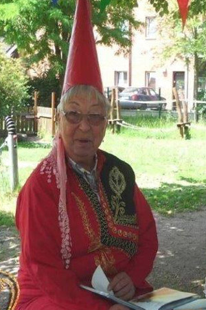 Die ehemalige Kinderkrankenschwester lässt sich immer wieder etwas Neues für ihre Besuche in der Kita einfallen. Aus einem Ägyptenurlaub hat sie eine schön bestickte Dschallabija mitgebracht. Zusammen mit einer ausrangierten und frisch beklebten Zuckertüte samt Schleier als Hut ist das eine perfekte Verkleidung für Märchen aus 1001 Nacht.