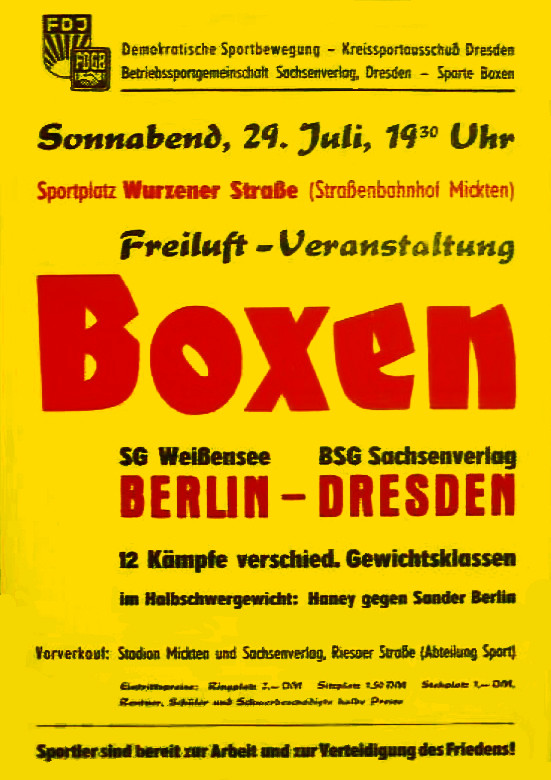 Die ersten DDR-Landesmeisterschaften im Boxen begannen am 21. Oktober 1949 in Erfurt und dauerten drei Tage. Die Titel errangen damals Boxer aus Görlitz, Sonneberg und Querfurt, aus Wittenberge, Cottbus, Berlin und Naumburg. Startberechtigt war auch Sachsenmeister Wolfgang Haney. Im Finale des Mittelgewichts unterlag er dem Berliner Horst Henatsch nur knapp.