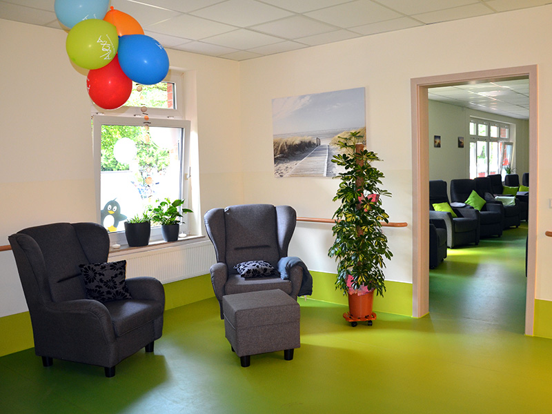 330 Quadratmeter bieten Platz für einen großen Aufenthaltsraum mit offener Küche und einen Ruheraum mit Entspannungssesseln, in dem die Gäste mal ein Nickerchen machen können. Dazu kommen noch ein Therapiezimmer mit Pflegebett, damit anstehende Arzt- oder Fußpflege-Termine in Ruhe über die Bühne gehen können, sowie barrierefreie Sanitäranlagen mit begehbarer Dusche und Notrufsystem.