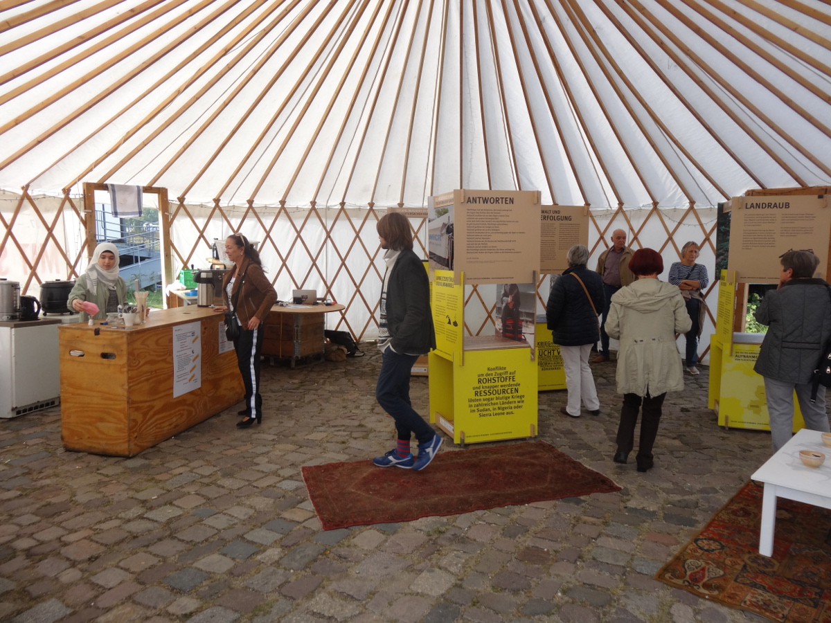 Das ehemalige ägyptische Flüchtlingsschiff „Al-hadj Djumaa“ ist gestern am Neustädter Hafen in der Leipziger Vorstadt angekommen. Radfahrer und Fußgänger kommen vorbei, bleiben stehen, klettern auf das Schiff und schlängeln sich zwischen den darauf stehenden Figuren hindurch. Wer mehr wissen will, nimmt sich einen Flyer oder liest die Poster, die rings um das Schiff aufgehängt sind. In einer Jurte gibt es weitere Möglichkeiten zur Information. Abends gibt es Livemusik – heute ab 17 Uhr proben Bossa Crossa und Sambalia öffentlich, morgen ab 18 Uhr spielen Banda Internationale und eine Nachwuchsband.