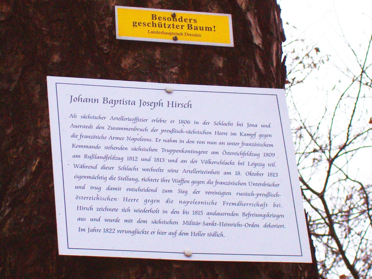 Dort war am 7. Oktober 1822 Johann Baptista Joseph Hirsch, königlich- sächsischer Hauptmann des Artillerie-Corps, zuletzt Kommandeur der 1. Reitenden Batterie, im Alter von fünfundvierzig Jahren von einem scheuenden Pferd gestürzt und zu Tode gekommen. Er wurde am 10. Oktober auf dem Inneren Neustädter Friedhof begraben. Ein Jahr später setzten ihm seine Kameraden das Denkmal. Die Inschrift, heute kaum bzw. nicht mehr lesbar, lautet: