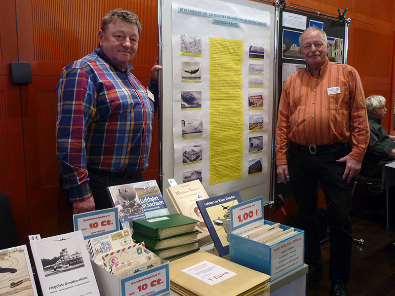 „Briefmarken sammeln war mir zu langweilig.“ Wolfgang Fiedler lacht. Seit er Teenager ist, beschäftigt er sich mit der sogenannten Aero-Philatelie, d. h. er sammelt Luftpostbelege, also Postkarten, Briefe und Aerogramme, die auf (Sonder-)Flügen transportiert und mit entsprechenden Abgangs-, Flugbestätigungs- und Ankunftsstempeln versehen sind. Parallel dazu befasst er sich mit der regionalen Luftfahrtgeschichte – fast zwangsläufig. „Flugzeuge sind ja für uns Mittel zum Zweck – ohne Flugzeuge gäb’s keine Luftpost.“ Also hat er mit Gleichgesinnten die Historie der Flugplätze in Kaditz (1913/14), auf dem Heller und in Klotzsche (eröffnet 1935) oder der Wasserfluglinie Dresden-Johannstadt – Magdeburg – Hamburg (1925) sowie die Biographien von Flugpionieren wie Hermann Reichelt, Melli Beese oder Wilhelmine Reichard erforscht. Auf dem 14. Geschichtsmarkt haben er und seine Aero-Philatelisten zum Thema „Luftschiffe während des Ersten Weltkrieges in Kaditz“ ausgestellt. Auf ihrer Tafel haben sie akribisch aufgelistet, wann welches Luftschiff auf dem Flugplatz ankam und wieder startete und was mitunter Verrücktes mit ihnen geschah.