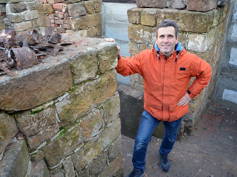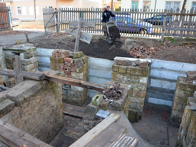 Teil des Bau-Spielplatzes sind auch die Keller-Reste des 1945 zerstörten Mehrfamilienhauses an der Markusstraße 13. Die Mauern und Treppen wurden schon vor mehreren Jahren freigelegt, aber nun werden sie nochmal ordentlich gesichert, sodass Heranwachsende ohne Gefahr darin spielen können.