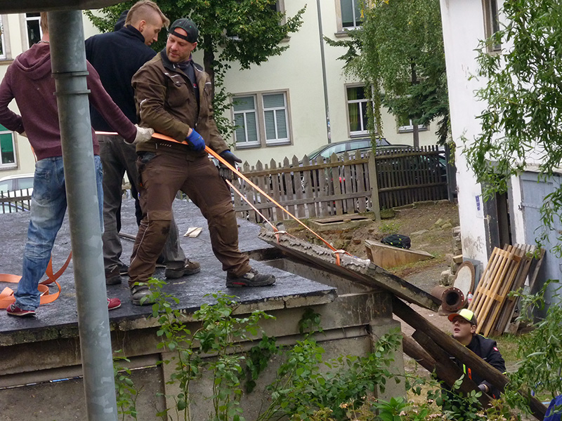 Doch die „rohe“ Wand ist nicht die einzige Baustelle auf dem Stoffwechsel-Gelände. Bereits seit September des vergangenen Jahres wird auf dem Grundstück mit der Hausnummer 13 kräftig gewerkelt. Eine DDR-Garage aus massiven Betonbohlen haben die Mitarbeiter und Jugendlichen abgetragen, und die erste Hälfte des oben erwähnten baufälligen Hauses ist auch schon verschwunden. „Die Decken waren ganz morsch, deswegen mussten wir dringend handeln“, erklärt Johannes Oßwald. Teil 2 des Hauses soll im Frühjahr fallen. An seiner Stelle wollen die Stoffwechsel-Mitarbeiter eine Art hölzernen Carport errichten. Darin sollen Holz, Werkzeug und sonstige Utensilien für den Abenteuer-Bau-Spielplatz gelagert werden, der sich über das gesamte Grundstück erstrecken wird. „Unsere Kinder sollen hier nach Herzenslust Löcher buddeln, Buden bauen und sie auch mal stehen lassen können.“ Deshalb bleibt das Grundstück ansonsten unbebaut.