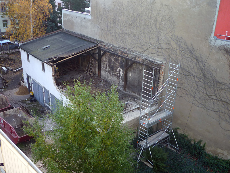 November 2017: Der Abriss ist in vollem Gange. Noch in diesem Jahr soll die entstandene schutzlose Wand einen neuen, „farblosen“ Putz erhalten. Foto: T. Tröger