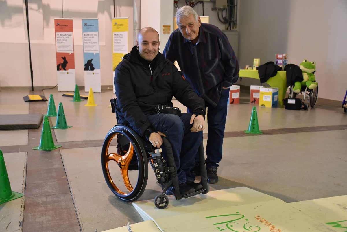 Im Selbsttest kann man diese Erfahrung nachvollziehen: Man muss zunächst das eigene Körpergewicht verlagern, um die vorderen kleinen Räder über das Hindernis zu bekommen. Danach wird viel Armkraft benötigt, um den restlichen Teil des Rollstuhls vorwärts zu bringen. Auch das Öffnen einer Tür aus einem Rollstuhl heraus will koordiniert sein. Schon nach einer Runde durch den Parcours bekommt man als Rollstuhl-Laie einen guten Eindruck davon, wie sich Rollstuhlfahrer im Alltag auf der Straße oftmals durchkämpfen müssen.