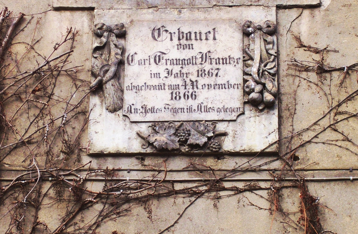 An der Giebelfront des Hauses befindet sich eine Tafel aus Sandstein. Sie soll erhalten bleiben. Die Tafel erinnert an die große Feuersbrunst von 1866. Ihr fielen acht Bauerngüter des Dorfes zum Opfer. Zu den Brandgeschädigten gehörte auch Carl Traugott Frantze (1825-1898). Er hatte sein Bauerngut im Jahre 1855 von der eigenen Mutter käuflich erworben. Von 1863 bis 1868 bekleidete er das Amt des Gemeindevorstandes. In dieser Eigenschaft hielt er den Ausbruch, Verlauf und die Folgen des Brandes schriftlich fest und fügte den Text als „Chronik des Jahres 1866″ den Trachauer Gemeindeakten bei. Dort heißt es: „1866, den 4. November, Sonntag abends, gegen 10 Uhr, ging eine schreckliche Feuersbrunst in unserem Dorfe auf. Bei Carl Gottlieb Frantze brach das Feuer von dem Heuboden und der mit Stroh gedeckten Scheune aus.“ Gemeindevorstand Carl Traugott Frantze und der von ihm genannte Carl Gottlieb Frantze waren nicht miteinander verwandt. Dieser hatte seinen Bauernhof 1860 für 5000 Taler dem Vater abgekauft. Der Hof befand sich hinter dem Gasthof zu Trachau, der seit 1881 den Namen „Goldenes Lamm“ führt.