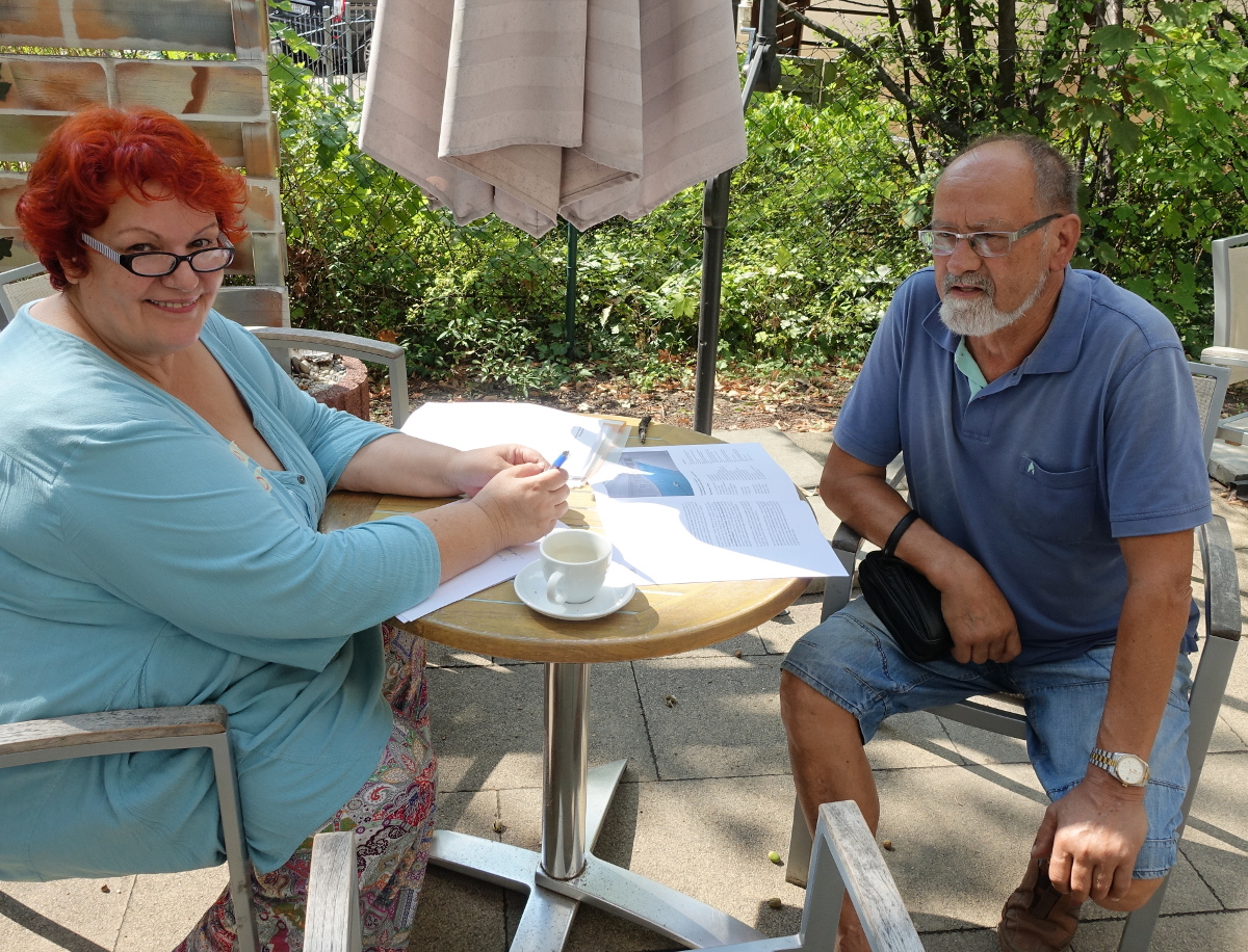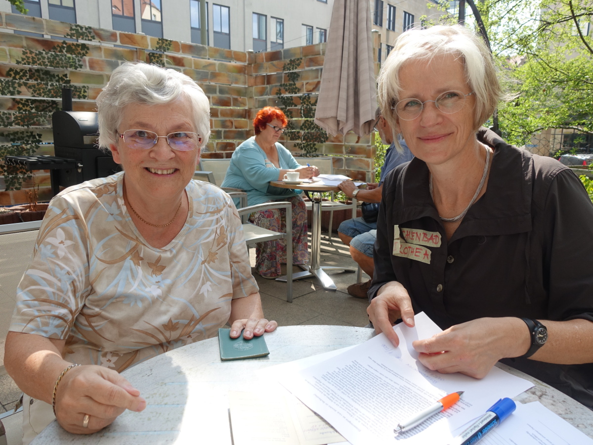 An den Nachbartischen halten Dorothea Becker und Claudia Rüdiger die Berichte der Seniorinnen und Senioren fest. Alle drei sind von der Bürgerinitative „Endlich Wasser ins Sachsenbad“. Dorothea Becker ist Architektin und hatte zusammen mit Christine Swaboda, die die Zeitzeugen mit Kuchen und Kaffee umsorgte, Anfang 2016 im Ortsbeirat das Konzept der Wiederbelebung des Sachsenbades als Gesundheitsbad präsentiert. Inzwischen ist diese Idee der Bürgerinitiative zum Kern der Konzeptausschreibung der Stadt bei der Suche nach einem privaten Investor geworden.