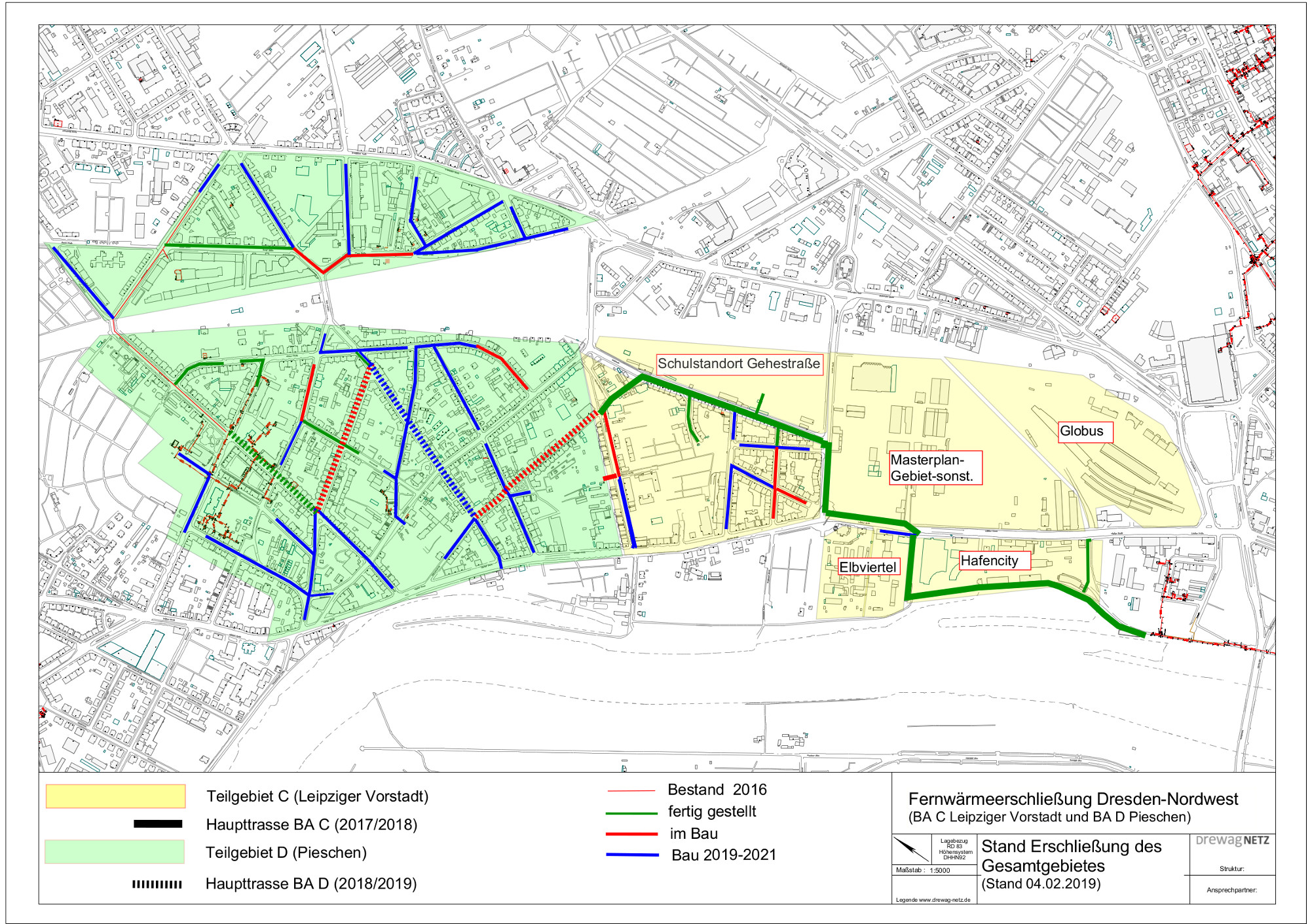 Auf 10,5 Kilometer Länge summieren sich die Rohrleitungen, die bis 2021 in der Leipziger Vorstadt und in Pieschen verlegt werden. 2.6 Kilometer sind bereits fertig gestellt. Dazu gehört der wichtige Abschnitt der Haupttrasse, der sich vom Menarini-Gelände am Elberadweg über das Areal der HafenCity, über die Leipziger Straße hinweg, vorbei am Schulstandort Gehestraße bis in die Konkordienstraße erstreckt. Die Arbeiten an der Haupttrasse, die zum Heizkraftwerk Mickten in der Wurzener Straße führt, sollen bis Ende 2019 abgeschlossen sein.