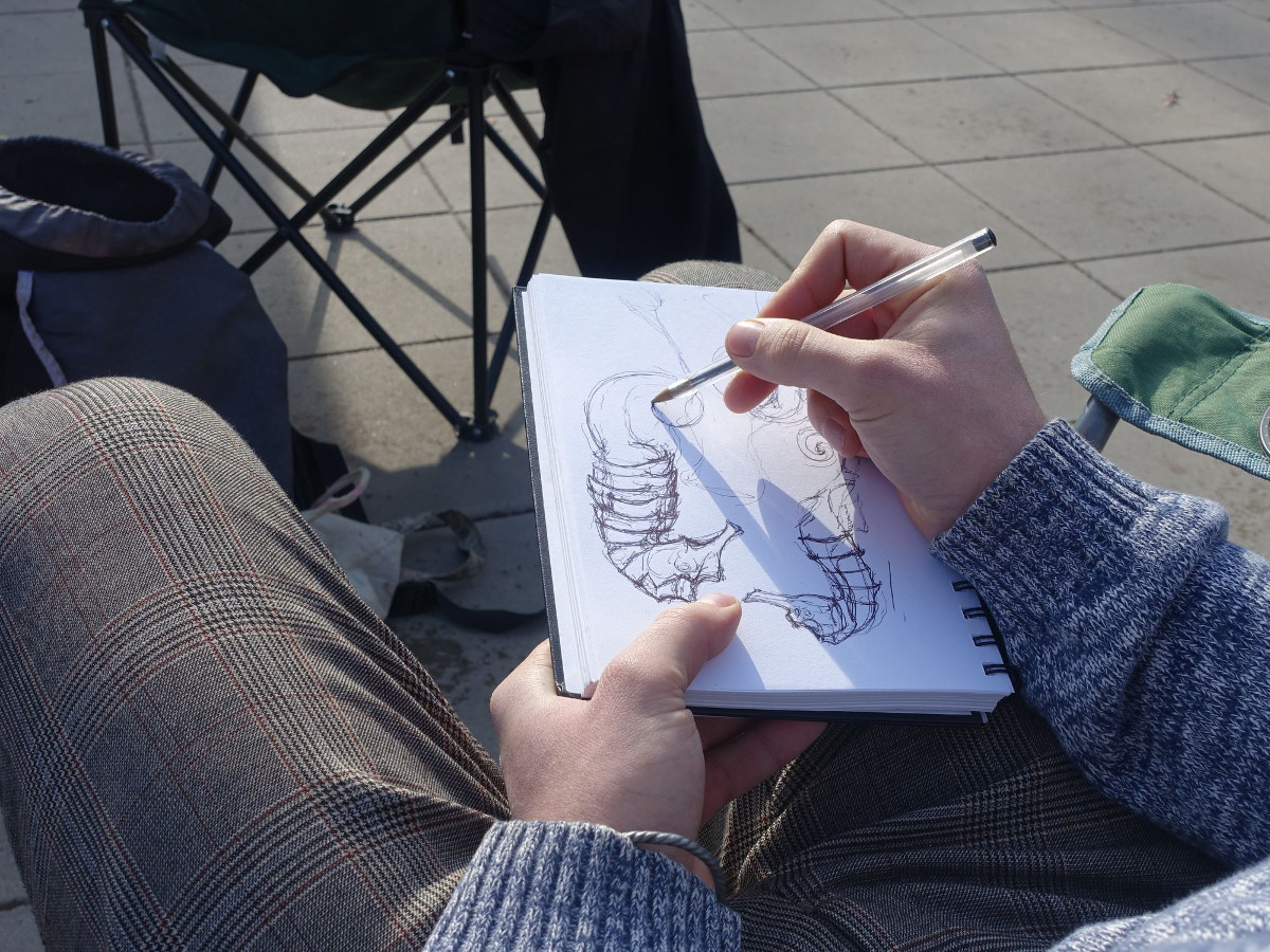 „Ich habe mich für einen Unterwasserdrachen entschieden“, sagt die 26-Jährige mit dem Künstlernamen FNC. Smok sprüht einen Ammoniten auf die Fläche, einen ausgestorbenen Kopffüßler mit dem bekannten schneckenartigen Gehäuse. Von Random stammt das Seepferdchen in der Mitte, das er kurz zuvor noch auf seinem Skizzenblock vervollständigt hatte.