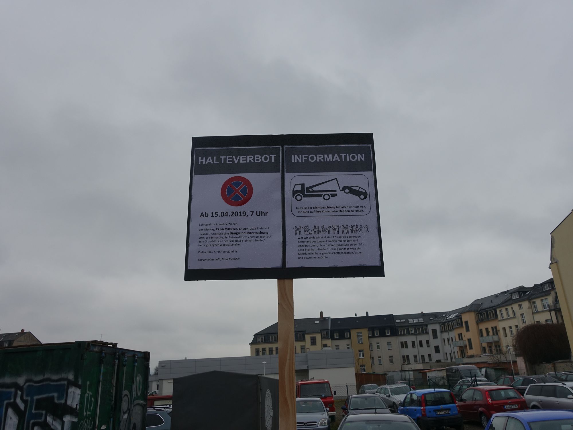 Die Baugemeinschaft „Rosa Melodie“ hat die Besitzer, die ihre Autos auf dem Grundstück an der Ecke Rosa-Steinhart-Straße / Hedwig-Langner-Weg abstellen, heute mit Handzetteln über die bevorstehende Baugrunduntersuchung informiert. Vom 15. bis 17. April braucht die Firma, die die Untersuchungen durchführt, Baufreiheit. Bereits vor zwei Wochen hatten die Bauherren Informationstafeln aufgestellt.