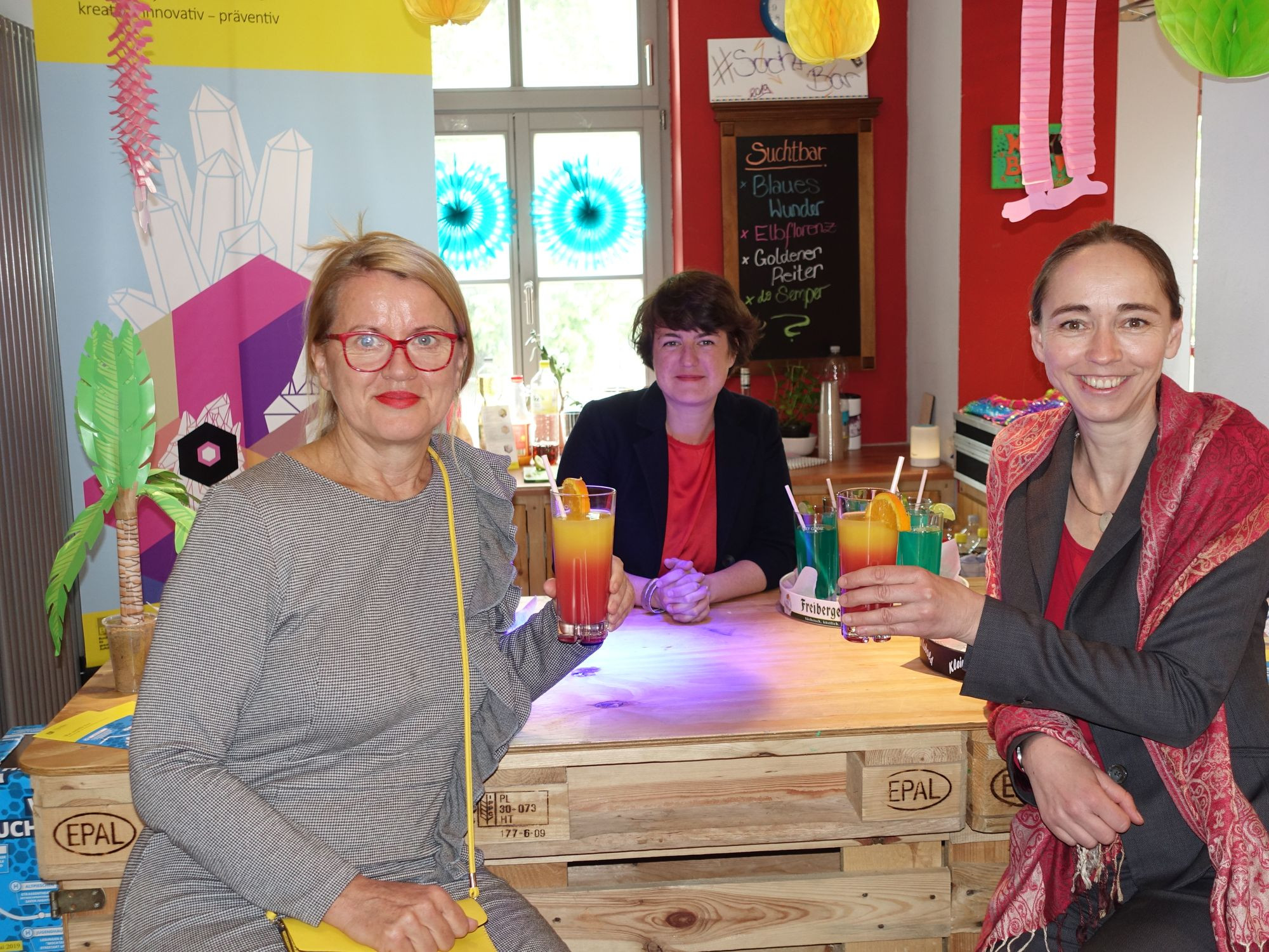 An der Bar sitzen Dresdens Suchtbeauftrage Kristin Ferse und Sozialbürgermeisterin Kristin Kaufmann (Linke). Die Aktionstage sollen den Panzer des Schweigens um das Suchtthema aufbrechen, beschreibt Kaufmann das Ziel. Man wolle dabei nicht mit dem erhobenen Zeigefinger agieren, sondern gehe mit den künstlerischen Mitteln ganz eigene und andere Wege. Am Freitag von 14 bis 19 Uhr wird die Aktion im Kinder-und Jugendzentrum „Emmers“, in Altpieschen und vor dem Einkaufsbahnhof Mickten fortgesetzt.
