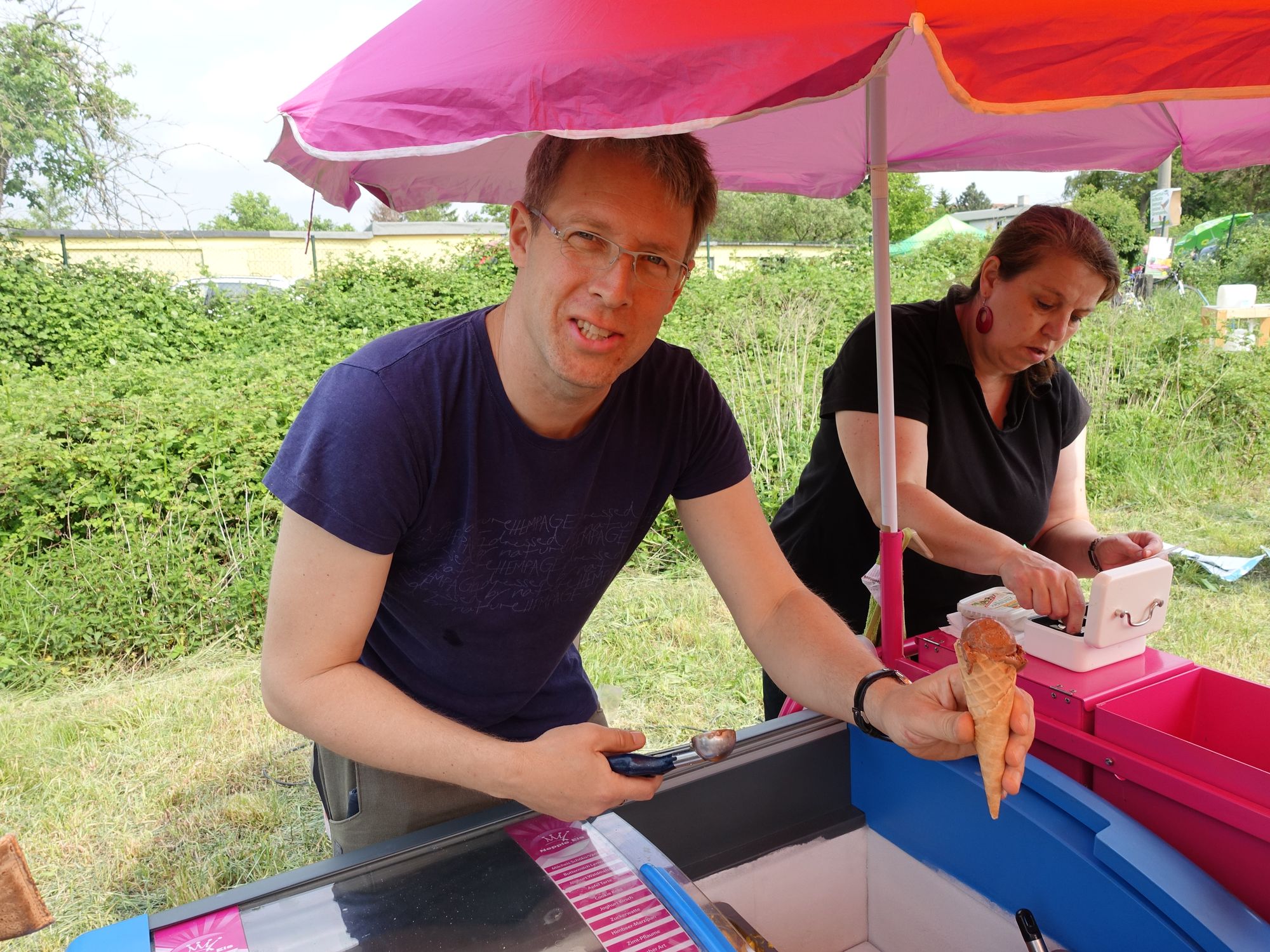 Dicht umlagert war am Nachmittag der kleine Eisverkaufswagen. Michael Hecht vom Hufewiesen-Verein und einer der vier Schulgründer der Kulturwerkschule, half mit aus.