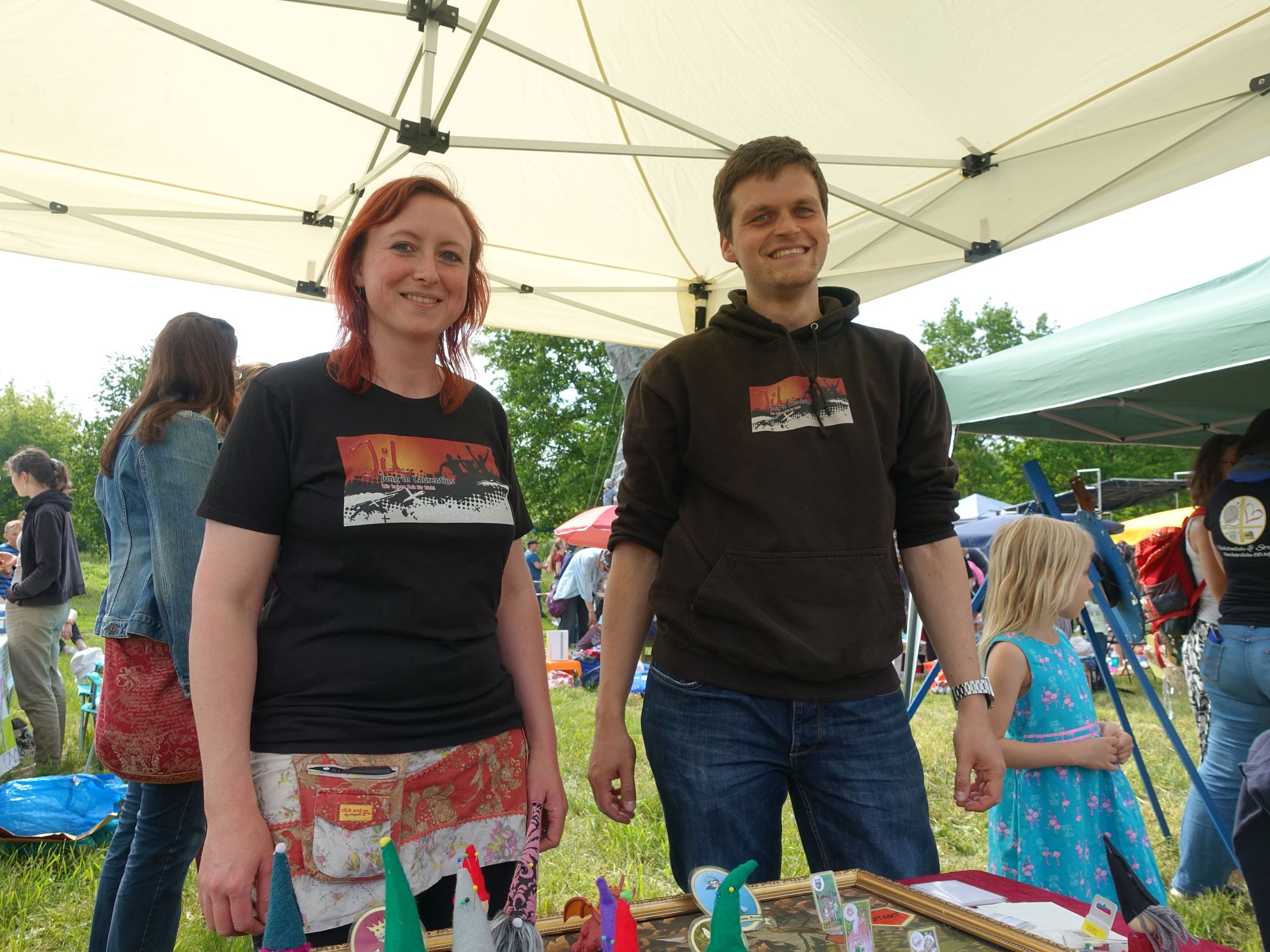 Für Mara Studen und Gerd Relitz von der Offenen Jugendarbeit in der Laurentiuskirchgemeinde Dresden (JiL) passte diese entspannte Atmosphäre perfekt ins Konzept. An ihrem Stand war Ausgangspunkt für die Suche nach verschwundenen Märchen. Übers Gelände verstreut waren 13 dekorierte Verkehrskegel, unter denen die Kinder die Märchenbilder finden mussten. Die Belohnung wartete bei der Rückkehr zum Stand in der Schatzkiste voller Süßigkeiten.