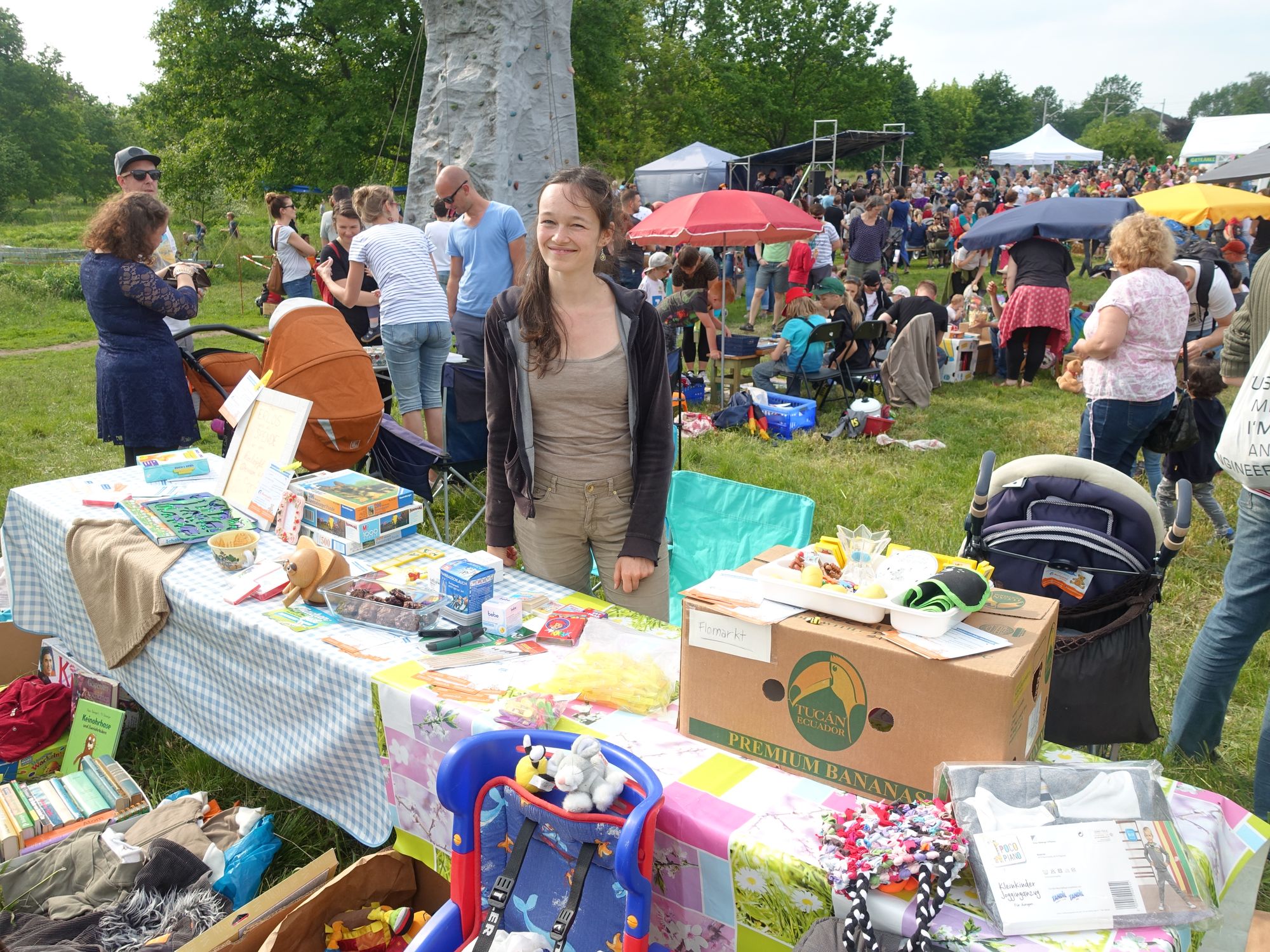 Kletterturm, Genussmeile, verschiedene Flohmarktstände mit Kinderspielzeug oder Büchern und ein abwechslungsreiches Programm auf der Bühne.