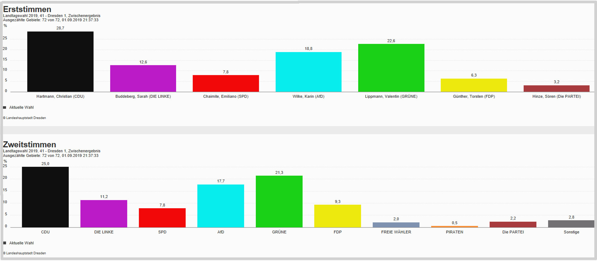 Landtagswahl 2019: Ergebnisse im Wahlkreis 41, Dresden 1. Quelle: Landeshauptstadt Dresden