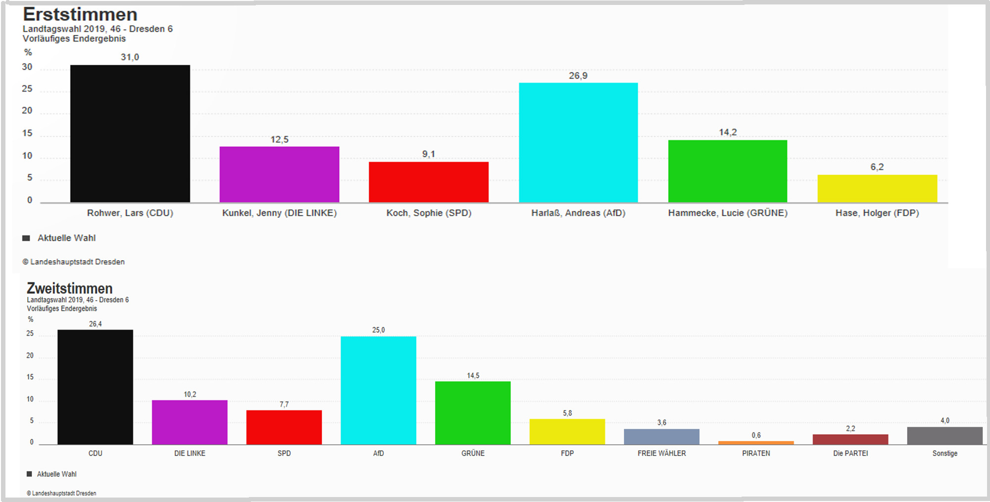 Landtagswahl 2019: Ergebnisse im Wahlkreis 46, Dresden 6. Quelle: Landeshauptstadt Dresden