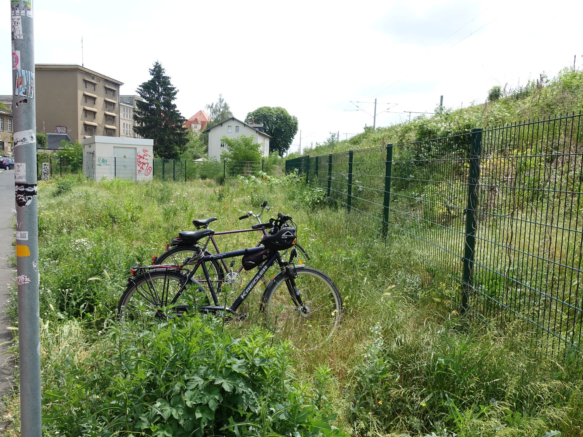 Abstellmöglichkeiten für Fahrräder sind rings um den Haltepunkt Trachau nicht zu finden. Claus Müller, Betreiber des Obst-und Gemüsehandels am ehemaligen Trachauer Bahnhof, hat einen alten Fahrradständer in eine kleine Bucht vor den Drewag-Kästen gestellt. „An meinem Zaun werden zum Glück nicht so viele Räder angeschlossen“, meint er. Gegenüber sei das schon anders.