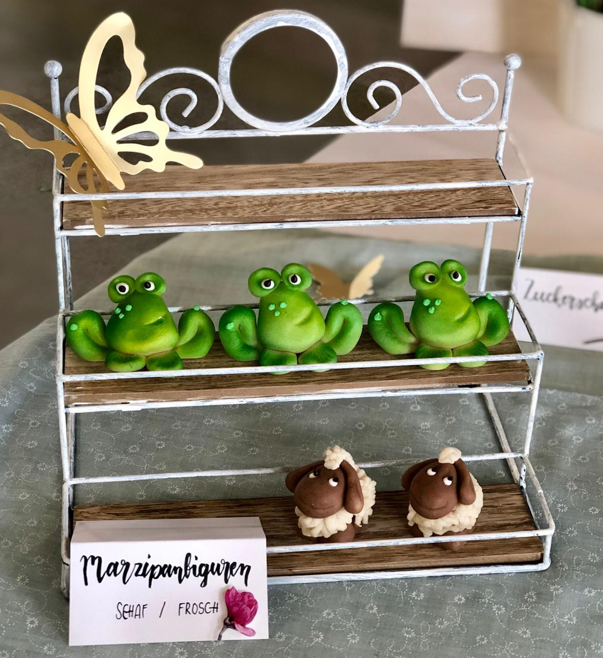 „Die Schriftart auf der Torte und den erklärenden Tafeln habe ich selbst entwickelt“, sagt sie und Silke Zimny fügt hinzu: „Das hat ihr zusätzliche Punkte bei der Prüfung eingebracht“. Bei der Auswahl ihrer Konditorlehrlinge schaue sie auch auf die Kunstnote. Da gewinne man einen Eindruck von der Kreativität der Bewerberinnen. Und Zeichnen sei wichtig im Konditorhandwerk, früher noch mehr als heute. So habe sie noch gelernt, eine Torte für den Kunden zunächst im 1:1-Maßstab zu zeichnen. Heute dagegen kämen viele bereits mit Instagram-Fotos als Vorlage ins Geschäft. Zudem gibt es längst einen Katalog – vor allem für die vielen Variationen bei den Hochzeitstorten. Die Marzipanfiguren – bei der Prüfungsarbeit waren es Frösche und Schafe – sind jede einzeln mit der Hand geformt. Die Lebensmittelfarbe wird heutzutage mit Airbrush aufgetragen. Früher musste das Marzipan komplett eingefärbt werden.
