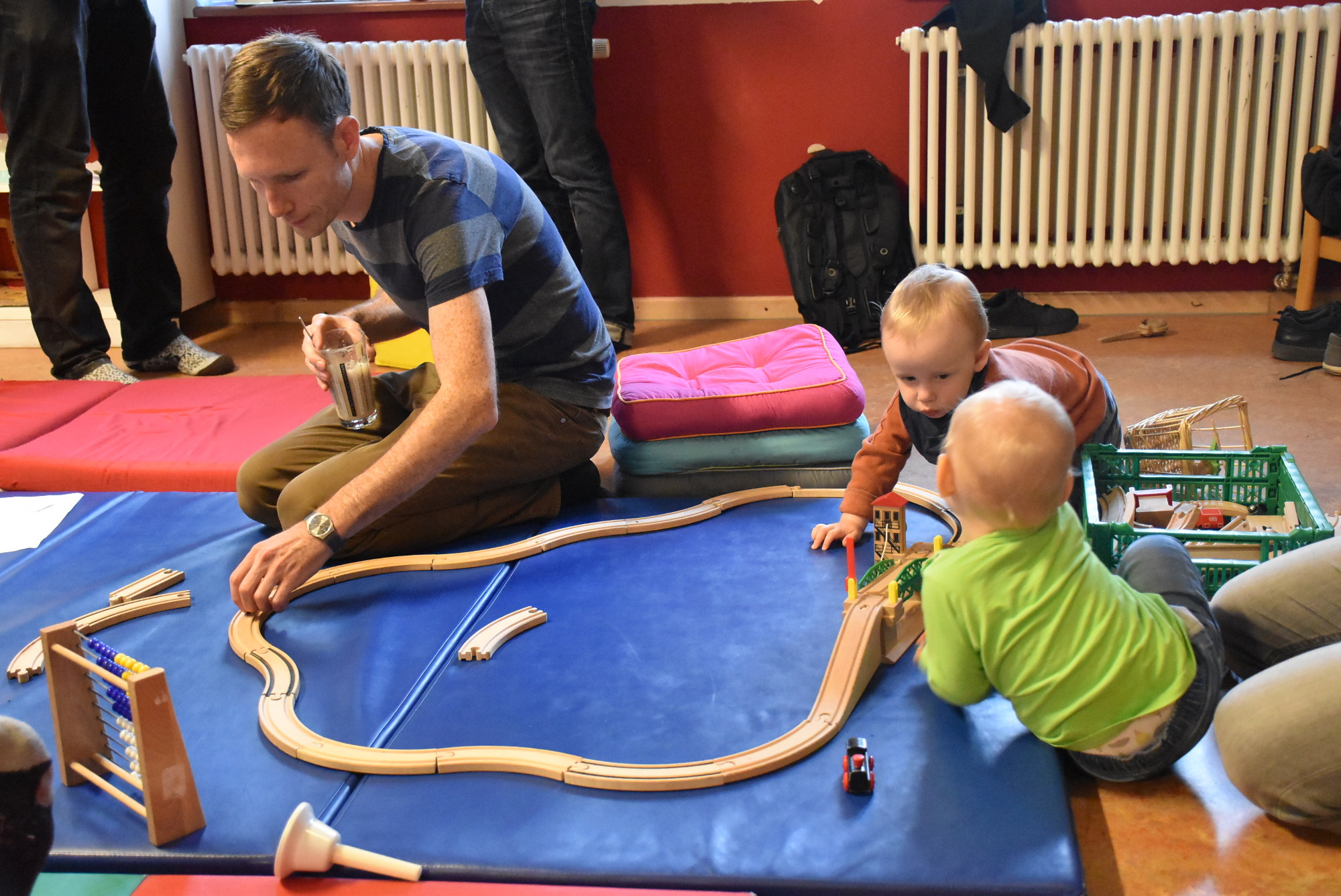 Die Kinder erkunden inzwischen die zahlreichen Spielmöglichkeiten, spielen selbständig, kommen nach und nach miteinander in Kontakt oder spielen auch gemeinsam mit ihren Vätern. Fast ein „Muss“ ist der Aufbau einer Holzeisenbahn. Es ist schön zu beobachten, wie dann auch die jungen Väter wieder zu Kindern werden.