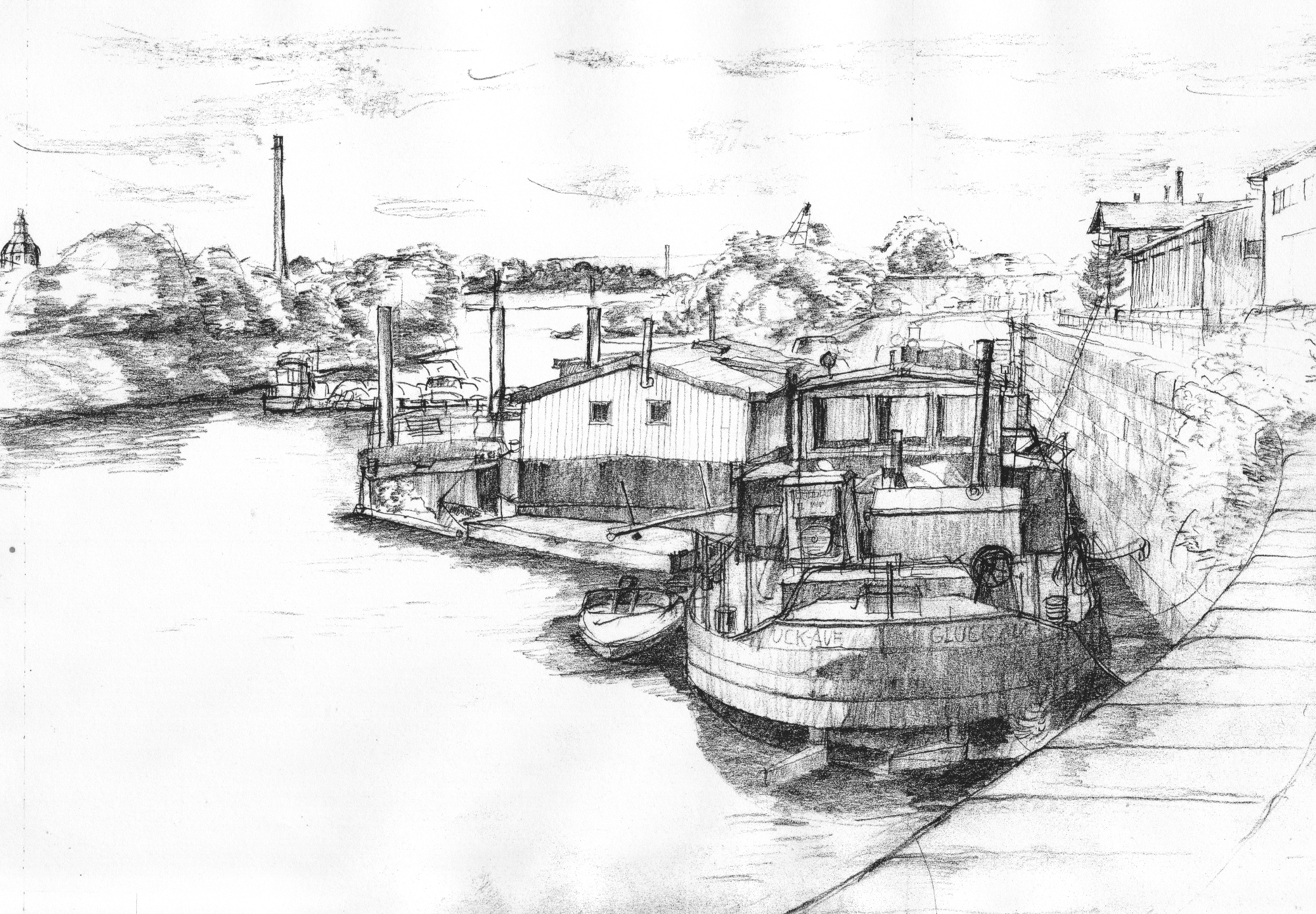 Die Zeichnung gibt einen Einblick In das mittlere Hafenbecken vor seiner heutigen Nutzung als Sportboothafen. Rechts sind die langgestreckten Lagerschuppen angedeutet, die noch vor wenigen Monaten etwas von dem einstigen Hafenflair vermittelten. Inzwischen wurden sie abgerissen. Der Güterumschlagplatz wandelt sich zur Hafencity, einem hochwertigen Wohnquartier.
