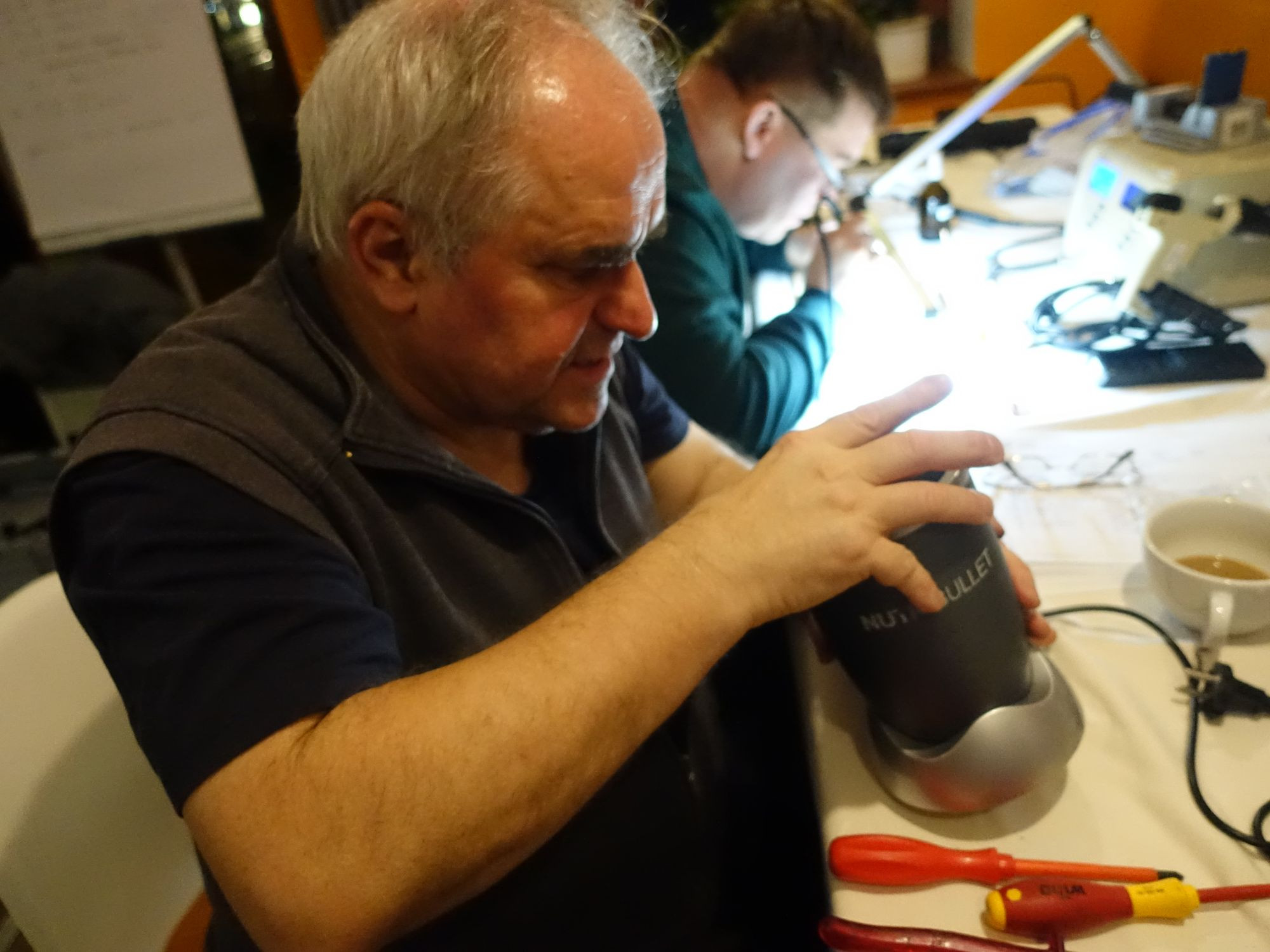 Michael ist Ingenieur für Eletrotechnik, inzwischen Rentner und seit 2015 dabei. Er schätzt die Erfolgsquote bei den Reparaturen auf 60 bis 65 Prozent. Auch wenn Großgeräte wie Elektroherde, Waschmaschinen oder Geschirrspüler nicht repariert würden, erinnerte er sich an einen Besucher, der mit seinem Betonmischer kam. „Er hatte das nötige Werkzeug und sogar Beleuchtung mit. Da haben wir den Mischer im Freien untersucht, den Fehler gefunden und konnten ihn reparieren“, erzählt er.
