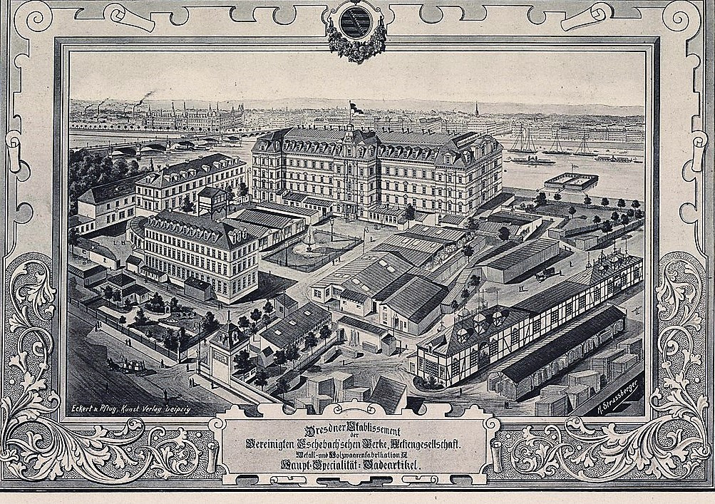 Der damals einundzwanzigjährigen Bertha Eschebach wurde am 10. Juli 1872 amtlich bestätigt, dass sie die Blechwarenfabrik „Schulze und Comp.“ gekauft und selbige „unter der Firma B. Eschebach, Blechwaren-Fabrik, eingetragen Neuegasse Nr.14 fortführen wird.“ (Quelle: „Die Vereinigten Eschebachschen Werke…“,Heidrun Reim, Dresdner Geschichtsbuch 7 / 2002)