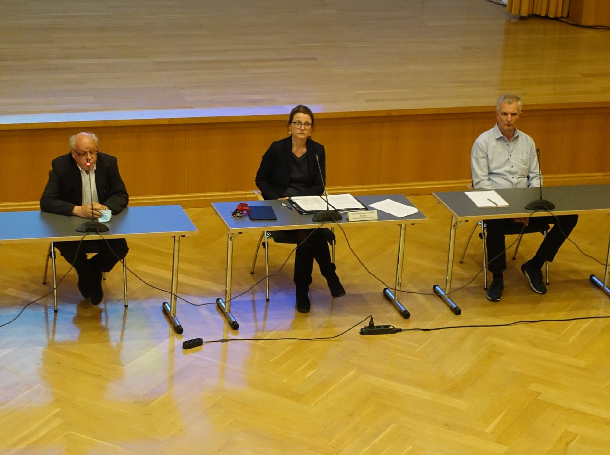 Burkhard Borchert (l.) erläuterte die Neubaupläne. Thomas Röber (r.) vertritt den Eigentümer. Annekatrin Klepsch leitet die Ausschusssitzung. Foto: W. Schenk