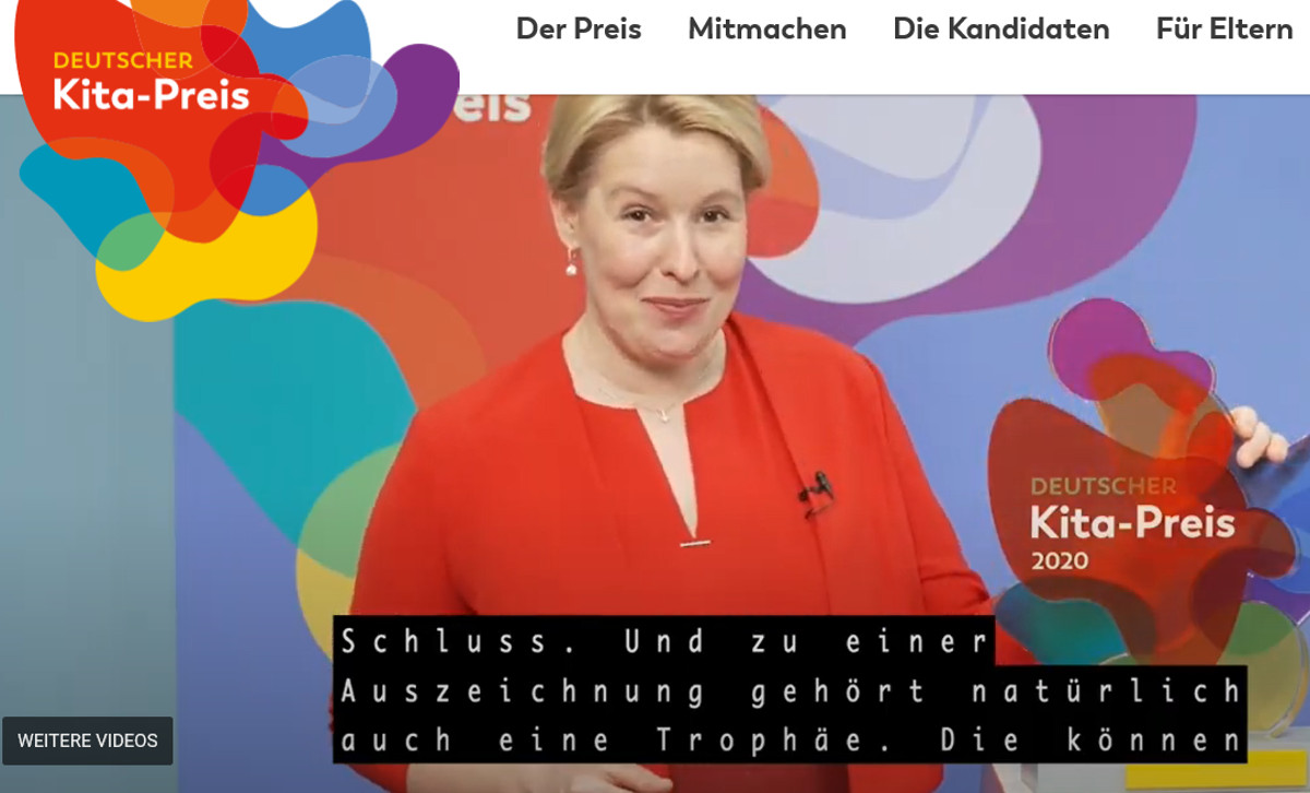 Der Deutsche Kita-Preis ist eine gemeinsame Initiative des Bundesministeriums für Familie, Senioren, Frauen und Jugend und der Deutschen Kinder- und Jugendstiftung in Partnerschaft mit der Heinz und Heide Dürr Stiftung, der Gisela-Sdorra-Stiftung, der Karg-Stiftung, dem Eltern-Magazin und dem Didacta-Verband. Bundesfamilienministerin Franziska Giffey (SPD) lud am Ende der Award-Show alle Preisträger für den 1. Oktober nach Berlin ein. Denn, so sagte sie: „Die Trophäen können wir schließlich nicht digital überreichen.“ Das möchte sie gern persönlich nachholen und bei der Gelegenheit noch mehr über die Arbeit der Preisträger-Kitas erfahren.