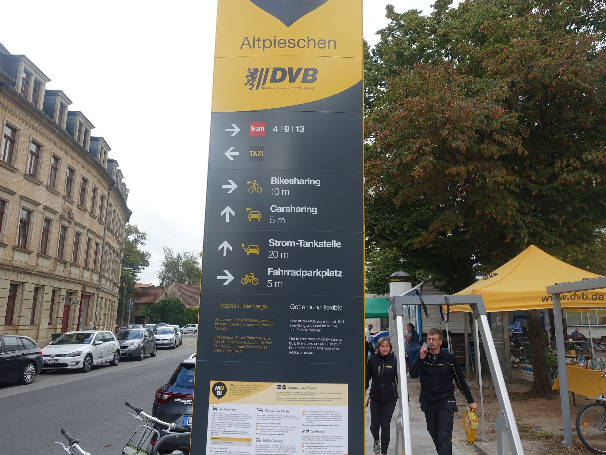 Die Mobipunkt-Premiere für den Stadtbezirk feierten die Kooperationspartner Stadt, Drewag, VVO, DVB, teilAuto, ADFC und sz-bike im September 2019 in Altpieschen. Hier steht neben Nahverkehr, Auto und Fahrrädern auch ein Lastenrad zur Verfügung. Ein weiterer Mobi-Punkt ist inzwischen auch an der Haltestelle Wilder Mann mit drei Carsharing-Fahrzeugen und sechs Leihrädern eingeweiht worden.