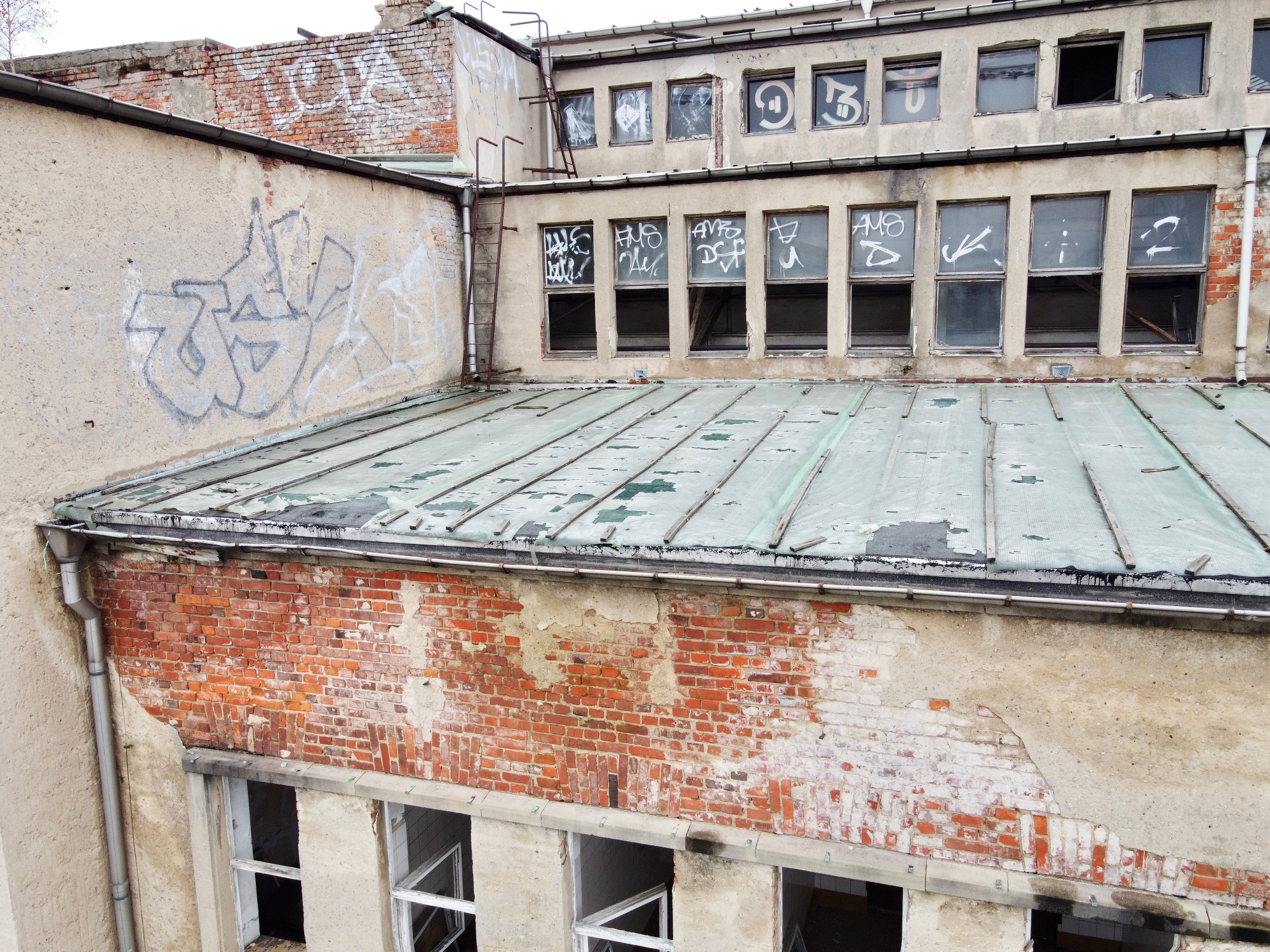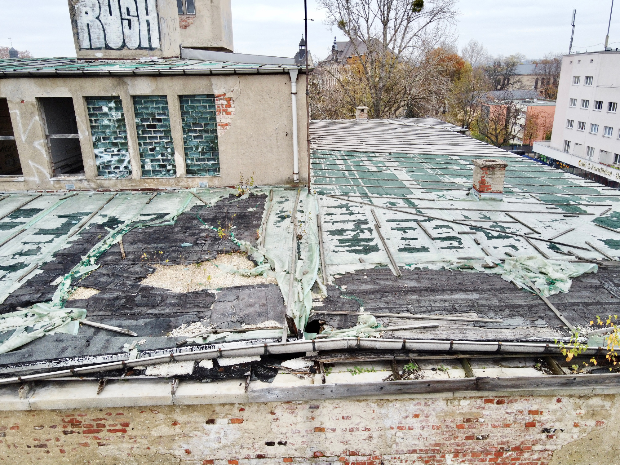 Baubürgermeister Kühn verwies bei der Referierung des bekannten Sachstandes noch einmal darauf, dass die Stadt derzeit kein Geld für eine Notsicherung des Daches eingestellt habe – 600.000 Euro würden dafür benötigt. Die Idee, dass die Stadt selbst das Gebäude übernehme und entwickle, wies er mit dem Satz zurück: „Die Stadt hat kein Nutzungskonzept.“ Jede weitere Verzögerung würde den fortdauernden Verfall des seit 1994 ungenutzten Gebäudes bedeuten. Um dies zu veranschaulichen, zeigte er Aufnahmen einer Drohne aus dem Monat November – sie zeigen den Zerstörungsgrad des Daches.