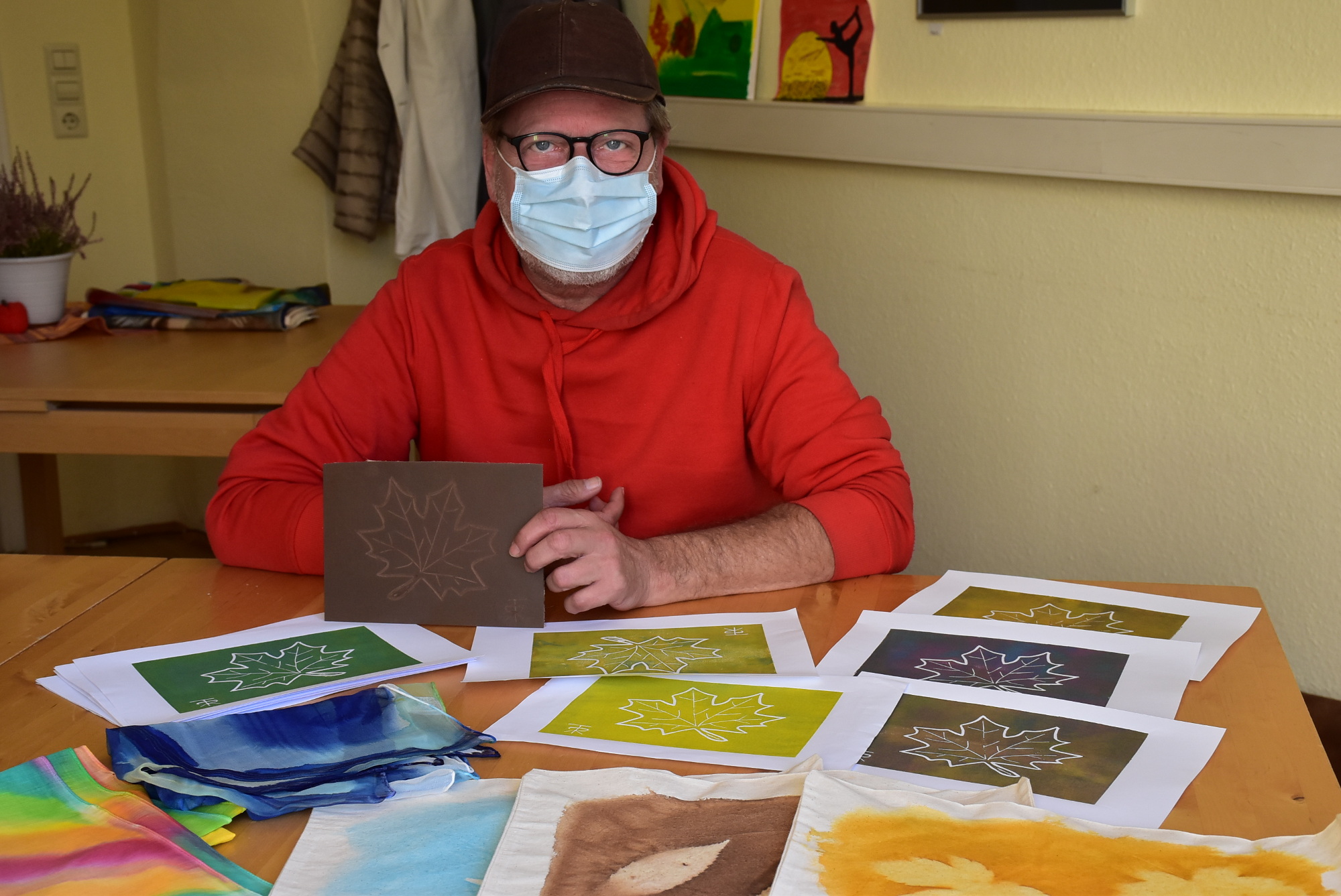Einer von ihnen ist Torsten Reinke. Der 56-Jährige engagiert sich seit etwa zwei Monaten direkt im „Auftrieb“. Der gelernte Maler und Lackierer hat Anfang der 90er Jahre eine Lehre zum Bankkaufmann absolviert. Nachdem sein Arbeitsplatz fusionsbedingt abgebaut wurde, hatte er sich mit einem Callcenter in die Selbständigkeit gewagt. Acht Jahre später musste er das Geschäft aufgeben. Das war 2016. Seitdem ist er arbeitslos, aber nicht ohne Zukunftsvisionen. Im handwerklich künstlerischen Bereich würde er gern beruflich Fuß fassen. Seine Kreativität konnte er in einer Maßnahme des Jobcenters unter Beweis stellen. In einer Einrichtung des Universitätsklinikums, in der auch krebskranke Kinder behandelt werden, konnte er individuelle kindgerechte Mutmach-Urkunden gestalten. Seit zwei Jahren lebt er in Pieschen und traf diesen Sommer zufällig eine Bekannte wieder, die beim DRK tätig ist. Von ihr erfuhr er vom Treffpunkt „Auftrieb“. Jetzt ist er regelmäßig freitags in der Malgruppe dabei und nutzt montags die Kreativangebote.