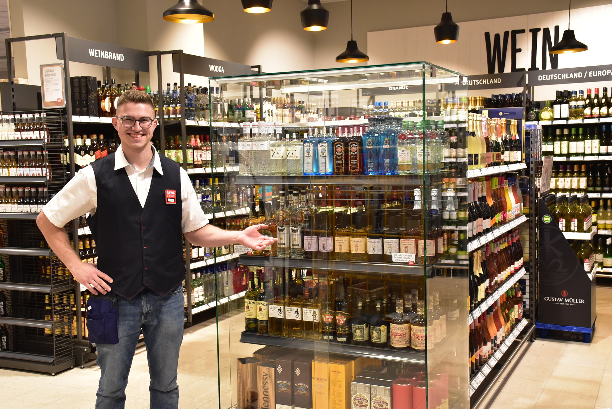 „Wir haben nun auch eine kleine, aber recht gemütlich wirkende Spirituosen- und Weinecke“, ergänzt Dominik Schulz, Assistent des Marktleiters. „In einer dekorativen Glasvitrine können wir auch außergewöhnliche Spirituosen anbieten.“