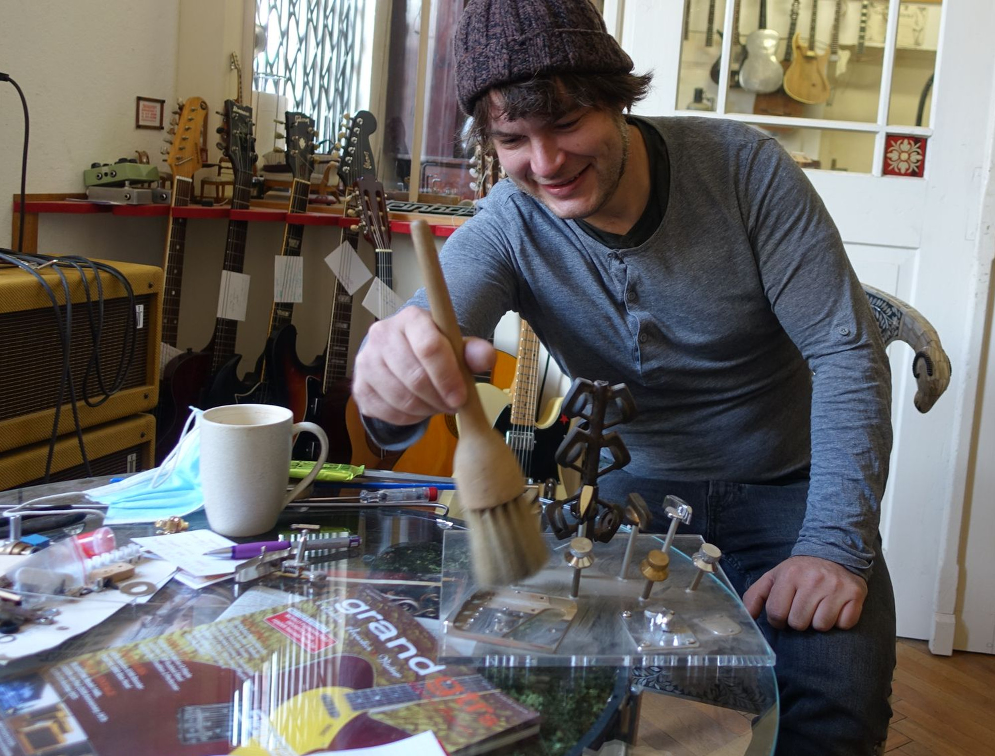 „Ich bin kein guter Gitarrist. Mir fehlt das Übungsgen. Darum bin ich kein Rockstar geworden.“ Das ist das große Glück für die vielen Gitarren, die in den letzten Jahren durch die fachkundigen Hände von Jan Steinbrecher gegangen sind. Statt den alten Lack zu retten, wären einige vielleicht einfach abgeschliffen und neu gestrichen worden, nennt der Gitarrenbauer ein Beispiel für den aus seiner Sicht frevelhaften Umgang mit einem alten Instrument. „Da sind dann schnell mal 50 Jahre Rock’n Roll verschwunden“, sagt er und beschreibt, wie groß der Einfluss der Beschichtung des Holzes auf die Klangeigenschaften ist.