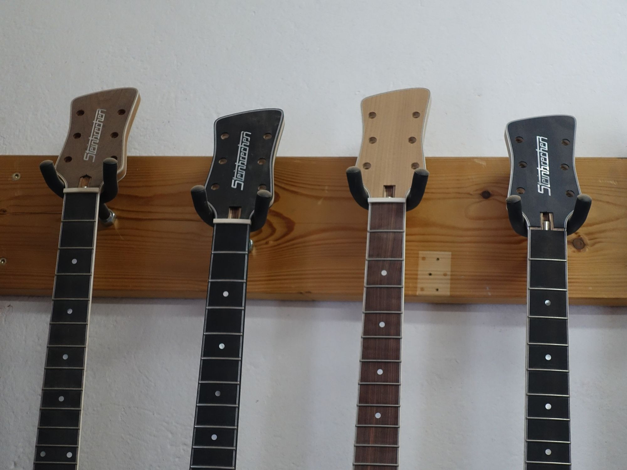 Damals war er auch das erste Mal auf einer Fachmesse und hat eine wichtige Lehre mitgebracht. „Ich habe begonnen, jedes Instrument, das ich baue, ordentlich durchzukalkulieren“. Das erwies sich als umso notwendiger, weil Jan Steinbrecher alles selbst macht. „Ich bin detailversessen. Bei mir gibt es nichts von der Stange.“ So sind selbst die Drehknöpfe, mit denen die Saiten gestimmt werden, Produkt seiner handwerklichen Fähigkeiten. Das würde man seinen Gitarren anmerken. „Die meisten Kunden gewinne ich, wenn sie eines meiner Instrumente in die Hand genommen haben.“ Das gilt vor allem für die von ihm entwickelte und gebaute E-Gitarre „Stromer“. Bis auf die Saiten ist alles selbst gefertigt. Heimisches Kirschholz für den Rumpf, Ahorn für den Hals, Sättel für die Saiten aus Rinderknochen. Allein für das Lackieren und Trocknen braucht es etwa sechs Wochen. Die Wartezeit für eine handgefertigte und individuell angepasste „Stromer“ liegt bei etwa acht Monaten.