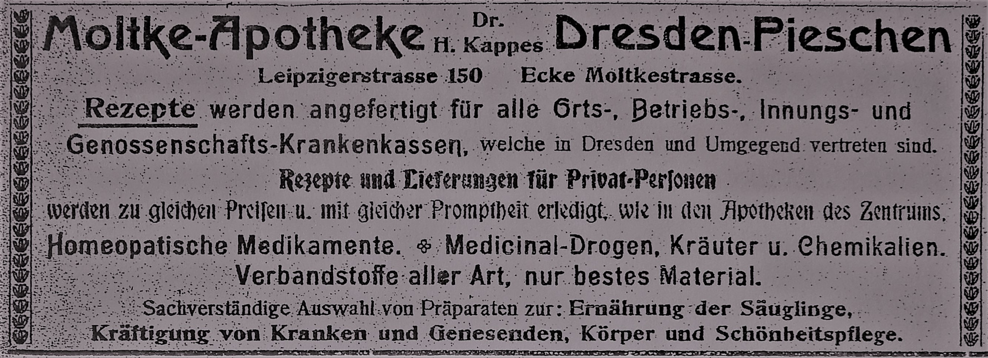 Die 1901 von Dr. phil. Heinrich Constantin Kappes im Mietswohnhaus Leipziger Straße / Ecke Moltkestraße eröffnete „Moltke-Apotheke“, ist die zweitälteste Apotheke im Stadtbezirk Dresden-Pieschen. Älter war nur die 1979 geschlossene „Hirsch-Apotheke“, die am 1. August 1891 vom Apotheker Carl F. Theodor Thiele im Hause Leipziger Straße Nr. 82 ihren Geschäftsbetrieb aufgenommen hatte. Die „Moltke-Apotheke“ wurde 1945 in „Pfauen Apotheke“ umbenannt und befindet sich seit dem 1. Mai 1995 im Pieschener Elbcenter. Die Umbenennung der Moltkestraße in Robert-Matzke-Straße erfolgte am 1. Juli 1946.