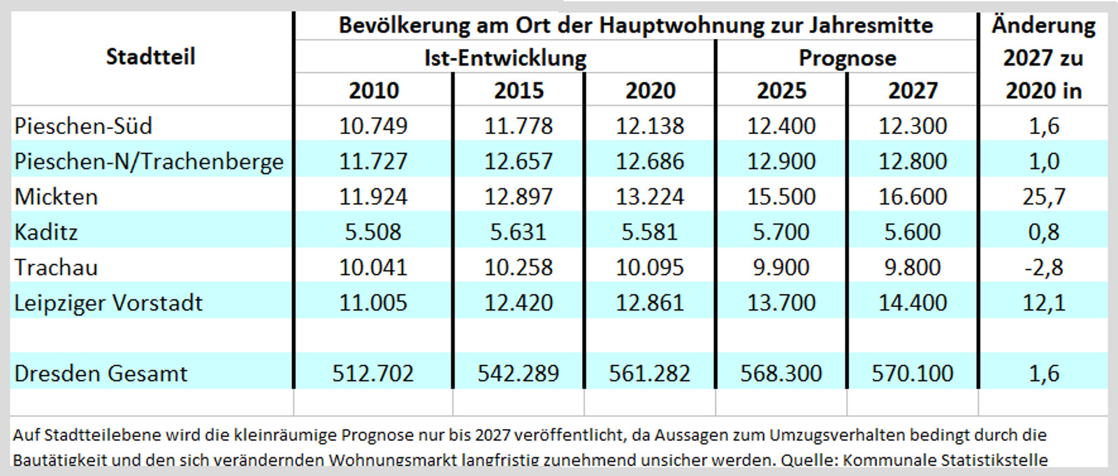 Die Entwicklung auf Stadtteilebene verläuft in Dresden sehr unterschiedlich. Aufgrund der hohen Bautätigkeit wird die Einwohnerzahl der Innenstadt und innenstadtnaher Stadtteile bis 2027 weiter wachsen.