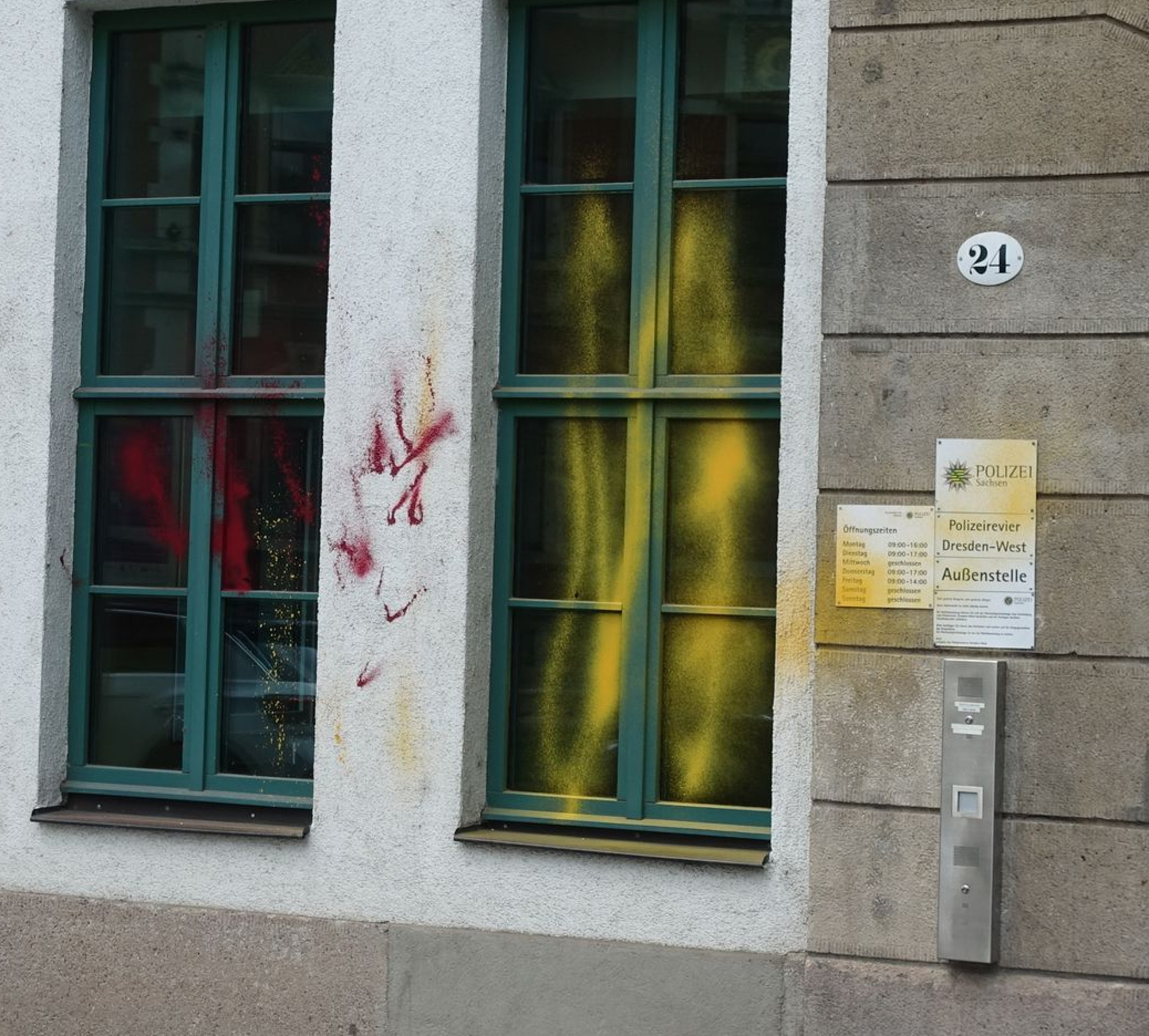 Das Bistro „Mein Frankreichladen“ und die Außenstelle des Polizeireviers Dresden-West in der Osterbergstraße sind in der vergangenen Nacht ins Visier von Randalierern geraten. Die Fassade des Polizeireviers ist mit roter und gelber Farbe beschmiert worden. Auch das Türschild ist mit Farbe besprüht.
