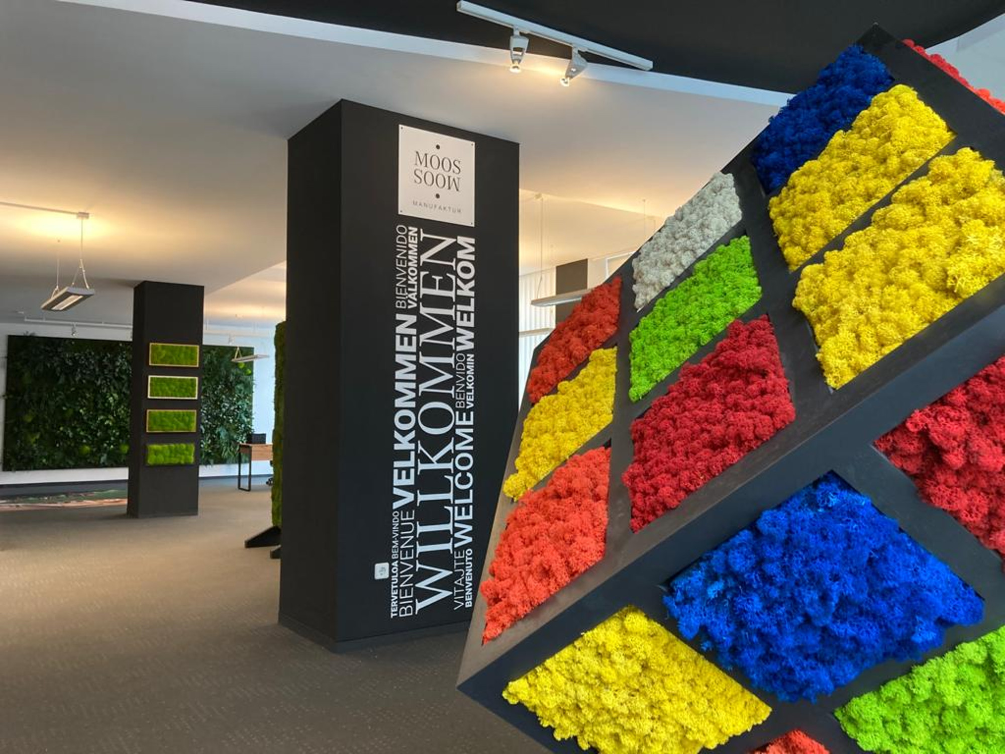 Die kleine sanfte Amalia misst nur 25 Zentimeter im Quadrat. Sie fühlt sich weich an, denn sie ist aus Islandmoos. Man kann sie unendlich kombinieren, die kleinen Quadrate zu großen Wandbildern aneinanderfügen. Amalia ist eigentlich grün, sie präsentiert sich aber gern auch in anderen Farben. André Tittel zeigt auf seine Musterbox mit Islandmoos, Ballenmoos, Waldmoos und Dschungelmoos. Und den vielen Farbmustern. Er ist der Standortleiter der Moos·Moos Manufaktur aus dem sächsischen Oppach, die vor wenigen Tagen ihr Büro an der Ecke Oschatzer Straße / Konkordienstraße eröffnet hat. Die Wände des gut 200 Quadratmeter großen Showrooms schmücken verschieden gestaltete Moos-Rundbilder, eine große Dschungelmoos-Komposition und Fotos von Referenz-Objekten in Hotels oder Spa-Bereichen. Ein großer Rubiks Würfel aus farbigem Moos und grüne Raumteiler stehen im Büro.