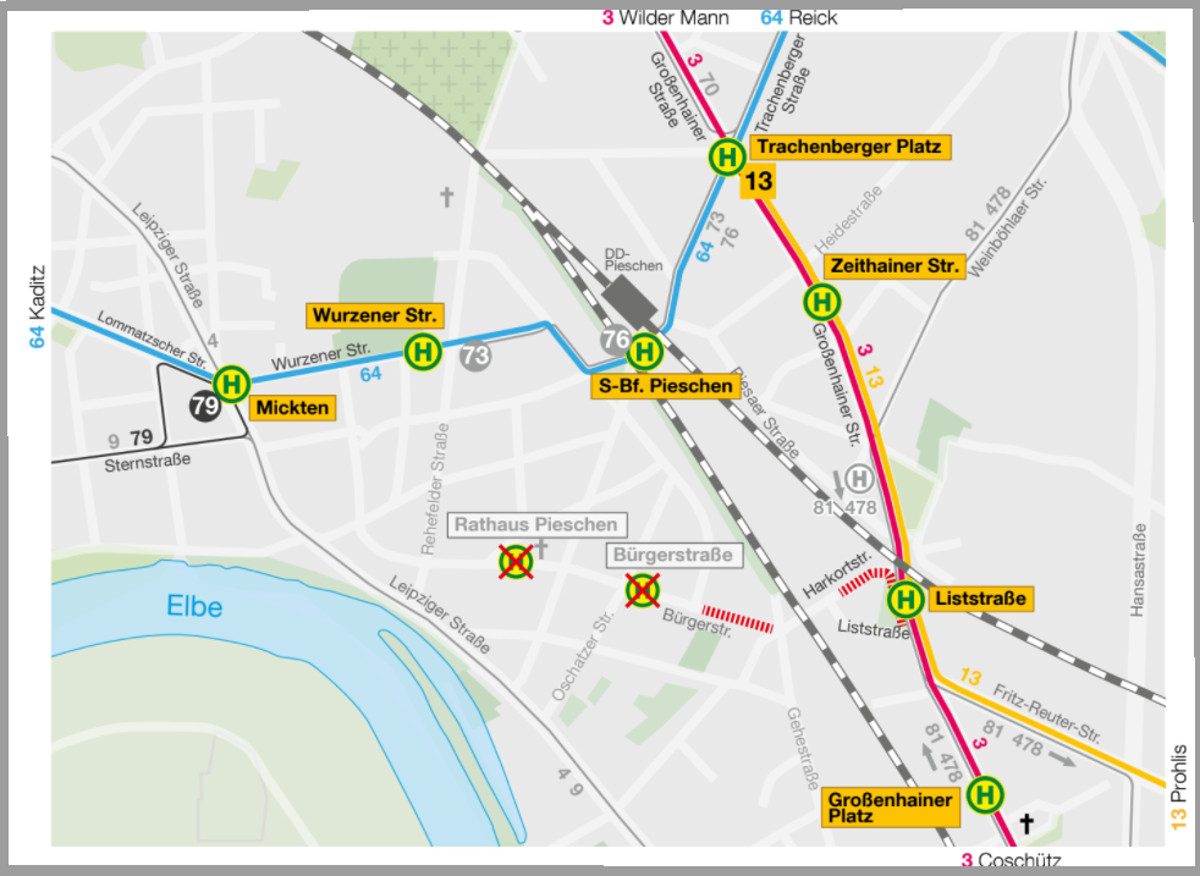 Die Haltestellen Bürgerstraße und Rathaus Pieschen können aufgrund von bereits laufenden Bauarbeiten der SachsenEnergie nicht durch Ersatzbusse bedient werden. Fahrgäste der Linie 13 sollten deshalb zur Weiterfahrt Richtung Mickten und Kaditz bis zum Trachenberger Platz mitfahren. Dort erfolgt der Umstieg zur Buslinie 64, die als Ersatzverkehr dient. Angepasst an den Fahrplan der „13“ wird die „64“ zwischen Trachenberge und Kaditz auch nachts durchgängig verkehren. Wer zur Sternstraße oder nach Übigau fahren möchte, benutzt in Mickten die Buslinie 79. Deren Einsatzzeit erweitert sich ab Sonnabend auf 5:00 Uhr bis 1:00 Uhr. Danach kann ein so genanntes Anruflinientaxi (alita) bestellt werden.