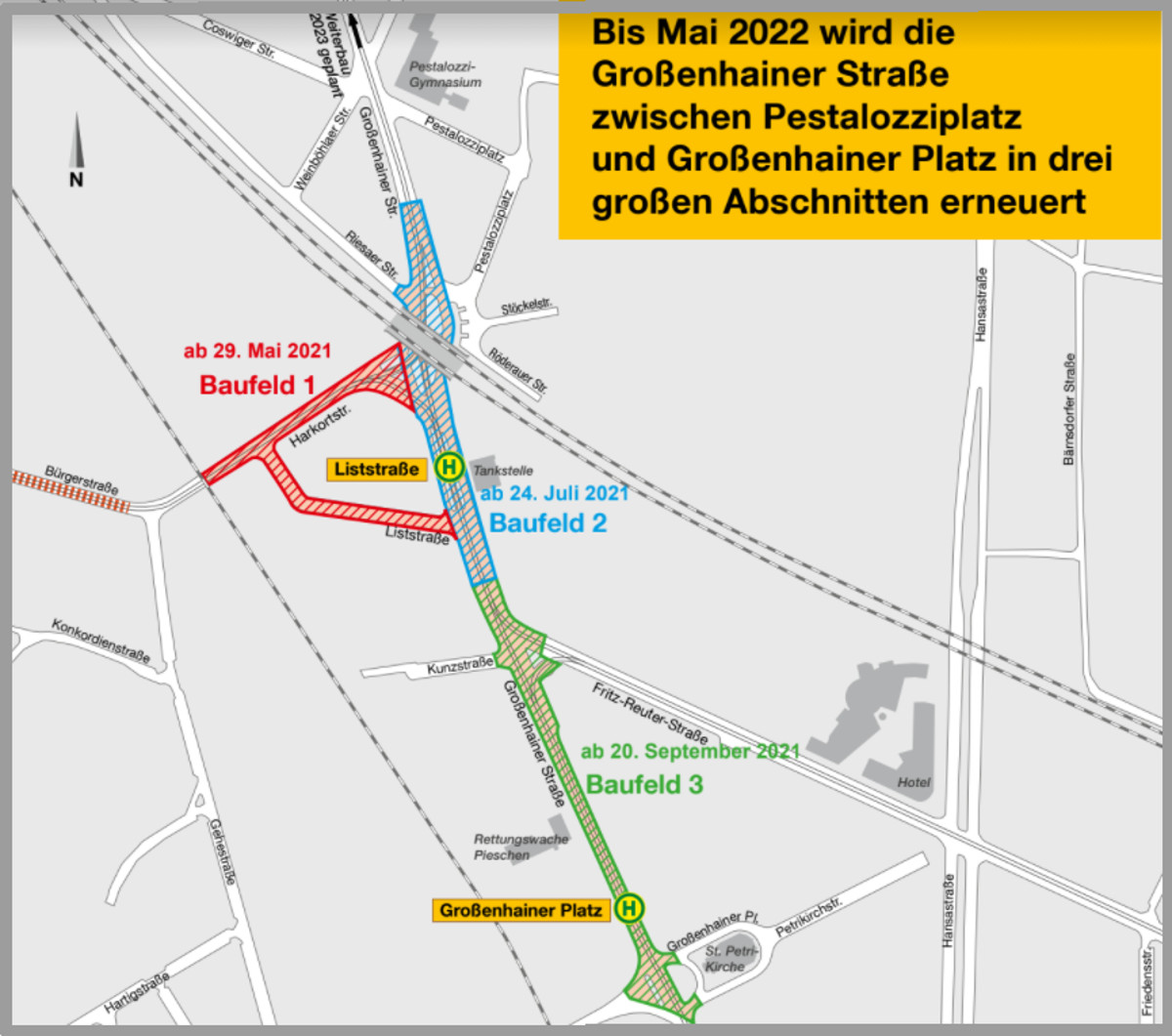Neben der Sortierung und Modernisierung aller unterirdischen Leitungen steht die Erneuerung von Straßenbahngleisen und Fahrbahnen auf dem Programm. Die Stationen „Liststraße“ und „Großenhainer Platz“ erhalten barrierefreie Zugänge. Hinzu kommen durchgehende Radwege, bessere Fußwege sowie neue Ampeln und eine moderne Straßenbeleuchtung. Die Straßenbahngleise werden so verlegt, dass dort künftig die etwas breiteren Stadtbahnwagen fahren können.