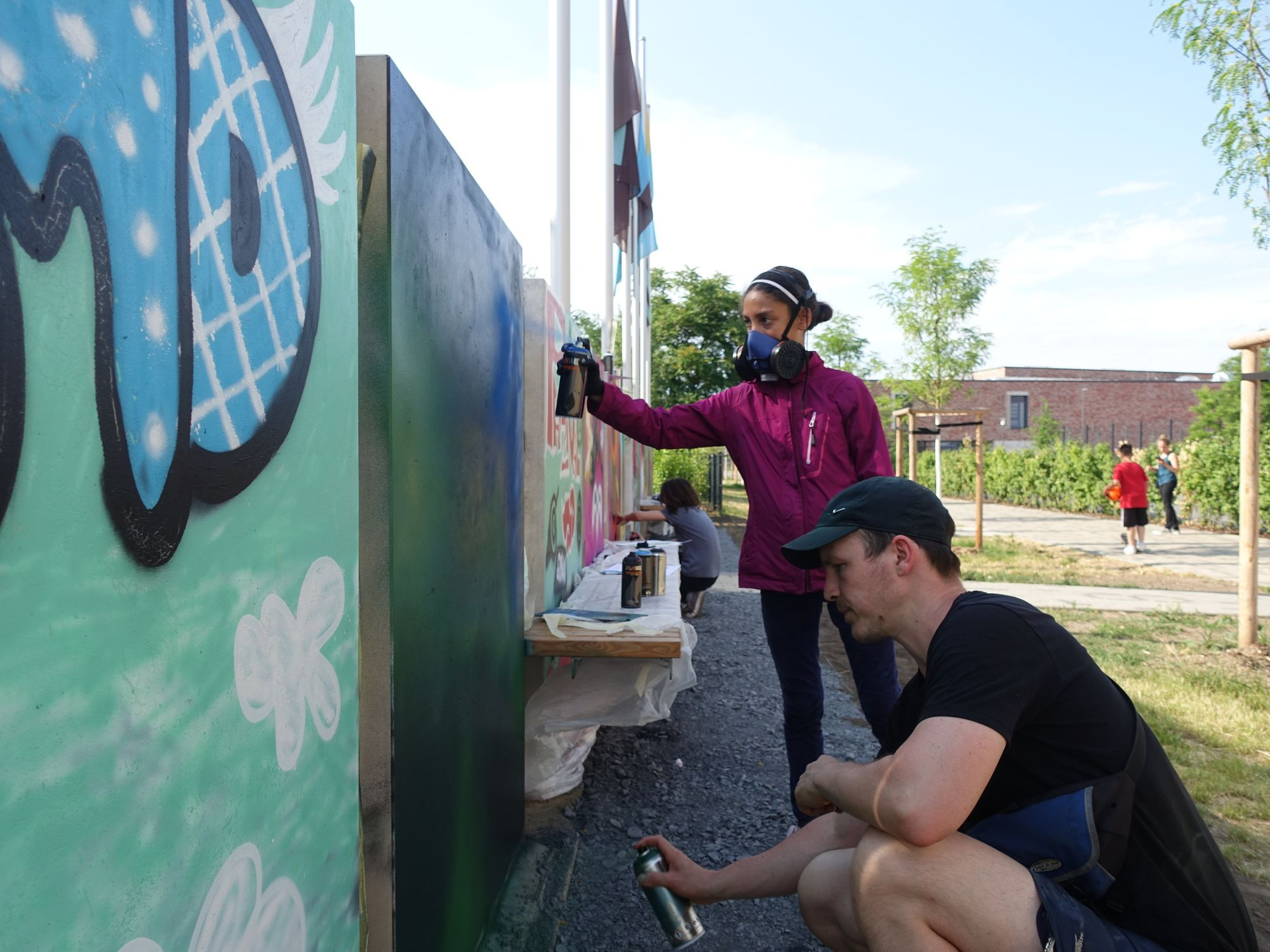 Die Flaggeninstallation stammt von Saeed Foroghi, die Graffitis sind in einem Workshop mit Kindern und Jugendlichen in den vergangenen drei Wochen entstanden. Saeed Foroghi wurde im Iran geboren und hat an der Hochschule für Bildende Künste in Dresden studiert. In seiner Rede erinnerte er am Sonnabend daran, dass es nun 16 Jahre her sei, dass er nach drei vergeblichen Anläufen endlich ein Visum bekam und zur Aufnahmeprüfung an die HfBK fahren durfte. Inzwischen ist er eingebürgert und lebt in Berlin. Der Kunstbeirat des Deutschen Bundestages hat gerade entschieden, eines seiner Kunstwerke anzukaufen. In einer kurzen Rede hat er zur Eröffnung seine künstlerische Intension erläutert.