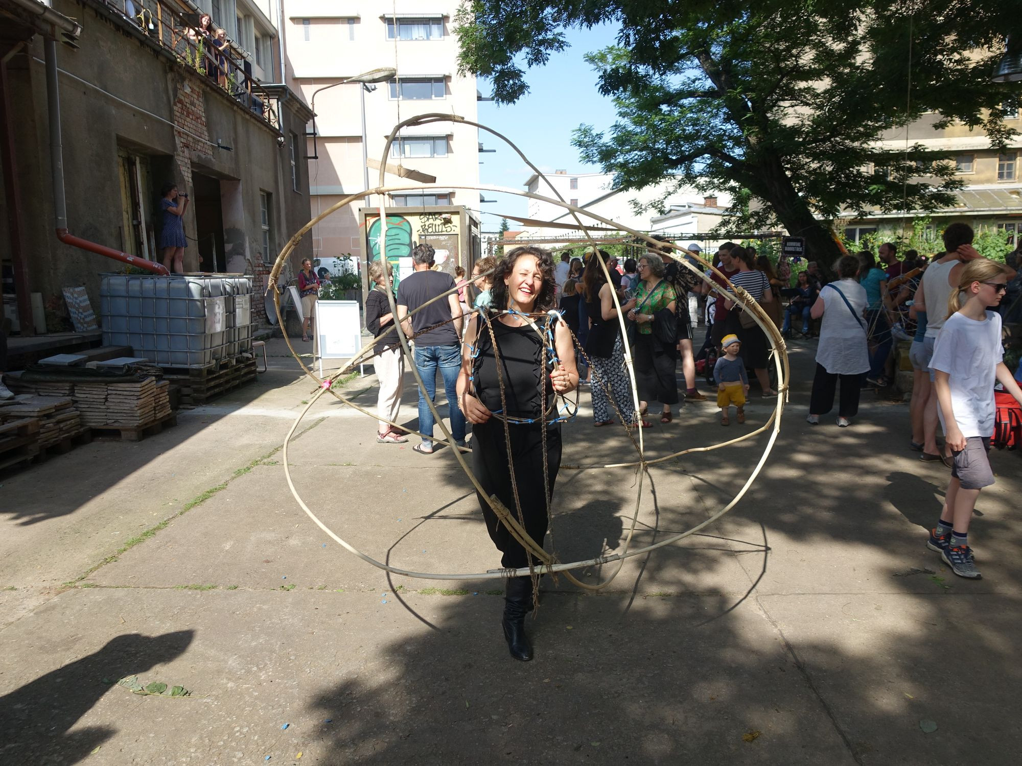 Während Dieter Beckert nach der Feier mit seiner Kommune Woodstock unter der Robinie musiziert, ist Anja Kempe mit der er die Eröffnungsfeier moderierte, mit ihren Raumzonenkostümen im Zentralwerk-Hof unterwegs. Sie gehörte zeitweise zum Vereinsvorstand und wurde 2017 als Professin für Fotografie/Medien an die Hochschule der Bildenden Künste Essen berufen. In der Corona-Zeit habe sie sich viel mit den inneren Eigenwelten beschäftigt und dabei auch Gleichgesinnte gefunden. Verteilt über den Hof findet man verschiedene Ergebnisse dieser Arbeit. Anja Kempe hat sich für Konstruktionen aus Weide entschieden. Man kann in sie hineinschlüpfen. „Da bewegt man sich ganz anders“, führt sie es auch gleich vor und macht sich auf den Weg durchs Publikum.