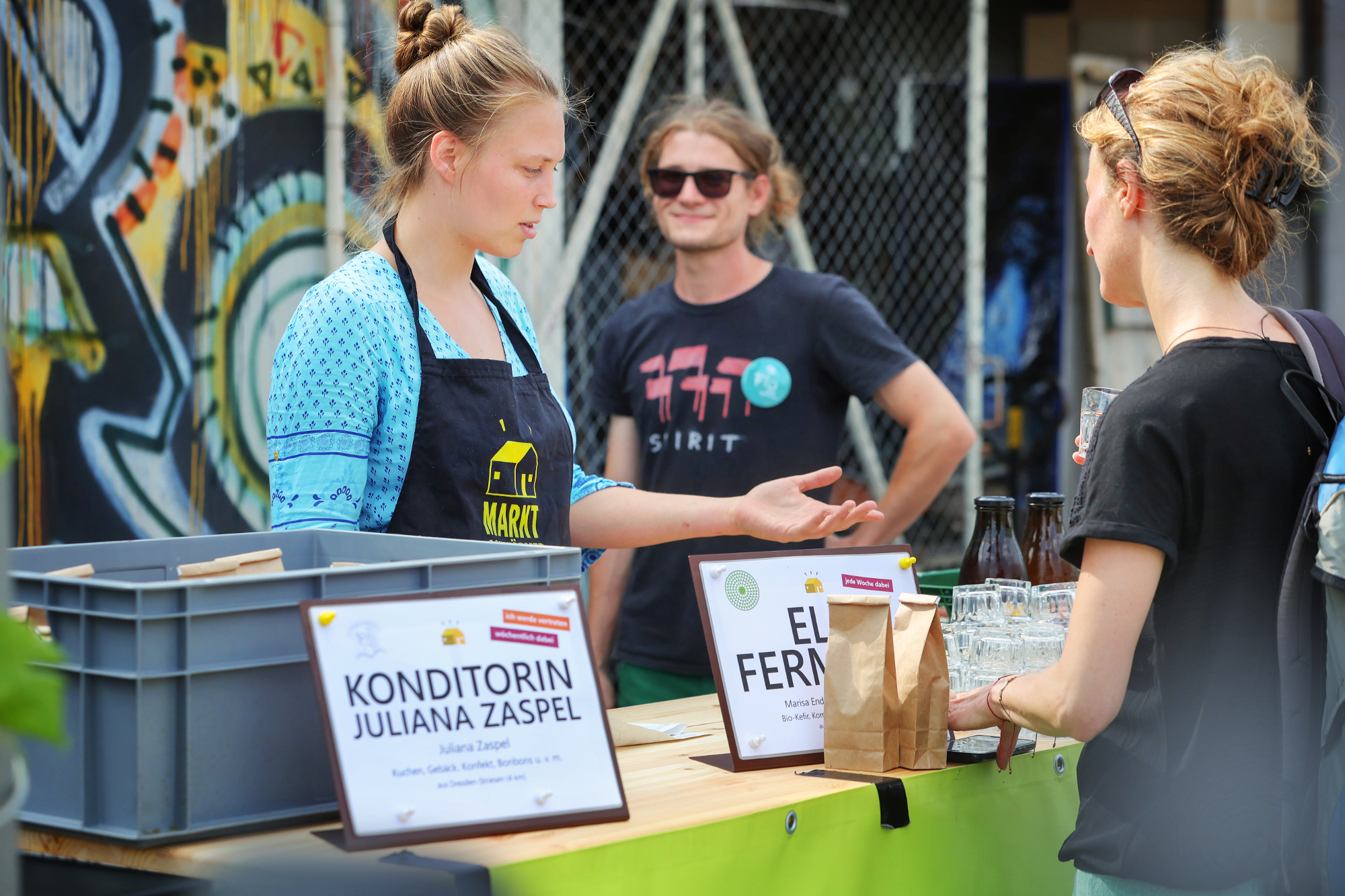 Es ist ein besonderer Nachmittag im Sommergarten der Geh8. Zu Gartengrün, Cafétischen und Sandkasten gesellen sich heute eine ganze Reihe Marktstände. Hierbei handelt es sich aber um keinen gewöhnlichen Wochenmarkt. Am vergangenen Freitag fand zum ersten Mal die Marktschwärmerei in Pieschen statt.