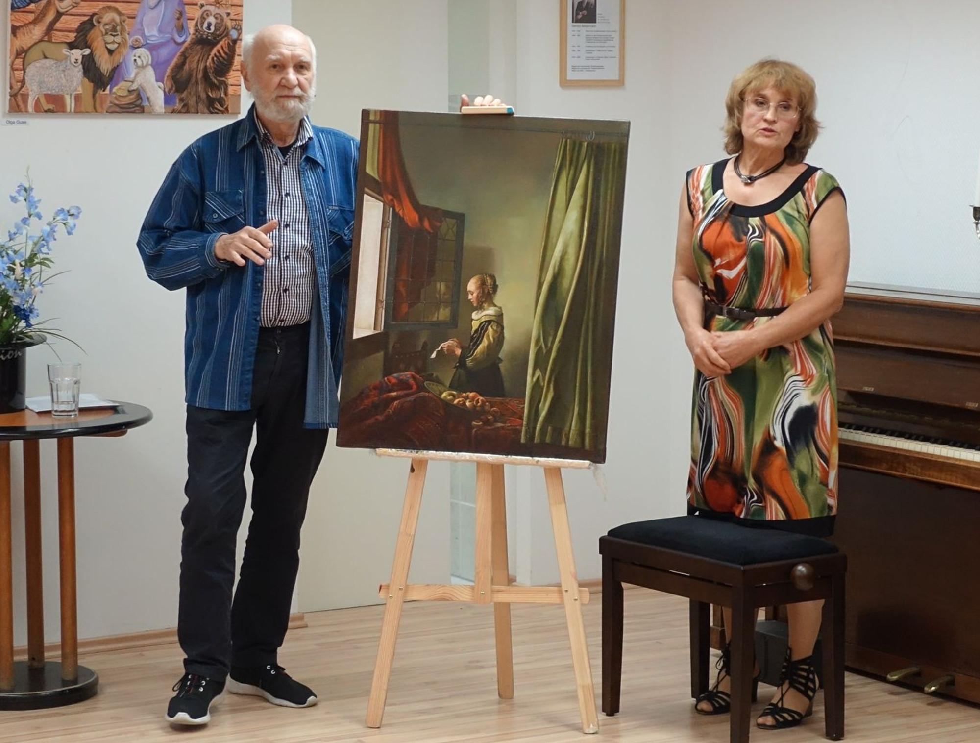 Semjon Beidermann lebt und arbeitet seit 1999 als freischaffender Künstler in Dresden. In Kiew geboren, verbrachte er seine Jugendzeit in der Ukraine. Von 1964 bis 1969 studierte er an der Kunsthochschule beim Moskauer Akademischen Künstlertheater an der Fakultät für Inszenierung, Spezialisierung Bühnenbild. 30 Jahre war er danach als Bühnenbildner am berühmten Theater an der Taganka in Moskau tätig. Im vergangenen Jahr widmete ihm das Kreativzentrum zu seinem 80. Geburtstag eine Extra-Ausstellung. Am Freitagabend erzählte er, wie ihn das Schaffen von Johannes Vermeer schon in seiner Jugend fasziniert habe. „Viele Reproduktionen habe ich über die Jahre gesammelt. Alle hatten jedoch verschiedene Farbstiche“. Später folgte dann eine intensive Beschäftigung mit den alten Maltechniken. Um das Bild „Brieflesendes Mädchen am offenen Fenster“ nachmalen zu können, habe er lange nach der richtigen grünen Farbe suchen müssen. Ein Freund aus St. Peterburg sei dann fündig geworden. Das Ergebnis seiner ein Jahr andauernden Beschäftigung mit dem Werk ist nun in der Ausstellung zu bewundern.