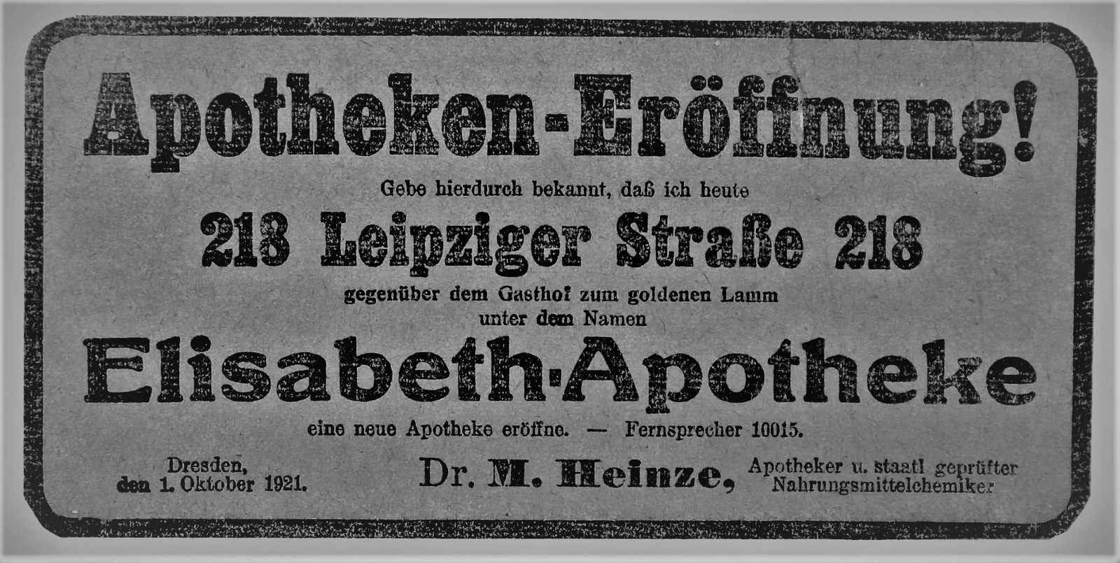 Am 8. März 1921 hatte das Sächsische Innenministerium dem in Staatsdiensten beschäftigten Apotheker und staatlich geprüften Nahrungsmittelchemiker Dr. phil. Maximilian Heinze den Auftrag erteilt, im Stadtteil Trachau und dort „…an der Leipziger Straße in der Nähe der Einmündung der Rankestraße bis spätestens 1.Oktober 1921…“ eine Apotheke zu eröffnen. Maximilian Heinze, geboren am 24. Juni 1872 in Radeberg, verstarb am 15. April 1950 in Dresden.